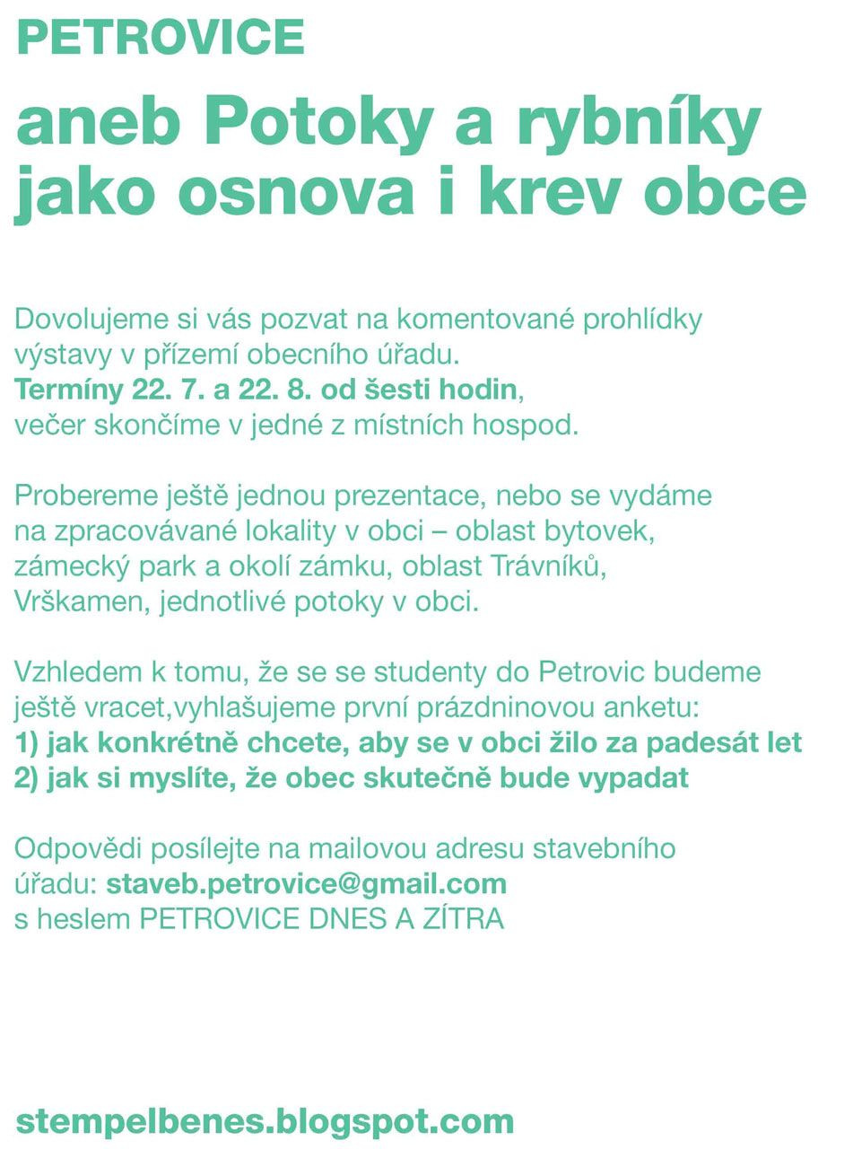 V letním semestru letošního roku byla ve školním ateliéru Jáno Stempela a Ondřeje Beneše tématem zadání vesnice. Cennou zkušeností pro studenty byla spolupráce přímo se zástupci obce. Jejich architektonické studie a analýzy by pak měly být základem pro navazující workshopy o řešení konkrétních míst v obci.