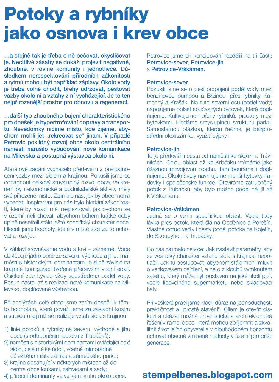 Petrovice-severPokusili jsme se o pěší propojení podél vody mezi benzinovou pumpou a potokem Brzina, přes rybníky Kamenný a Krašák. Na tuto severní osu (podél vody) napojujeme oblast současných bytovek, které doplňujeme. Kultivujeme i břehy rybníků, prostory mezi bytovkami. Hledáme smysluplnou strukturu parku. Samostatnou otázkou, kterou řešíme, je bezprostřední okolí zámku, využití sýpky.
