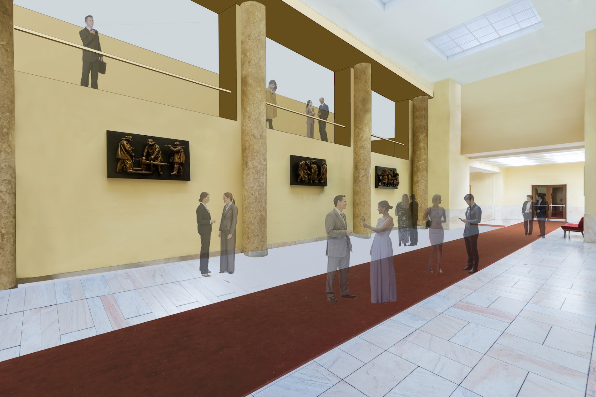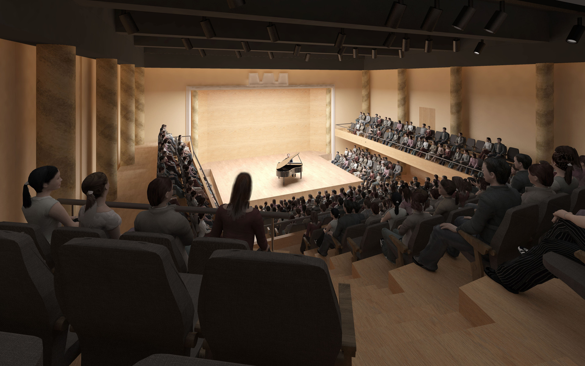 „K opláštění sálu bude použit patinovaný 100% recyklovatelný a vysoce flexibilní zinek. Dokonalou akustiku uvnitř sálu zajistí obložení z šedě lazurovaného javorového dřeva, které se běžně používá mimo jiné k výrobě houslí. Na stejném podlaží, jako jsou oba sály, vznikne speciální sklad na klavíry se stálou teplotou a vlhkostí, z něhož se budou téměř půltunové nástroje pomocí speciálních koleček přepravovat přímo na podium,“ vysvětluje spoluautor studie architekt Martin Kropáč z Architecture Acts.