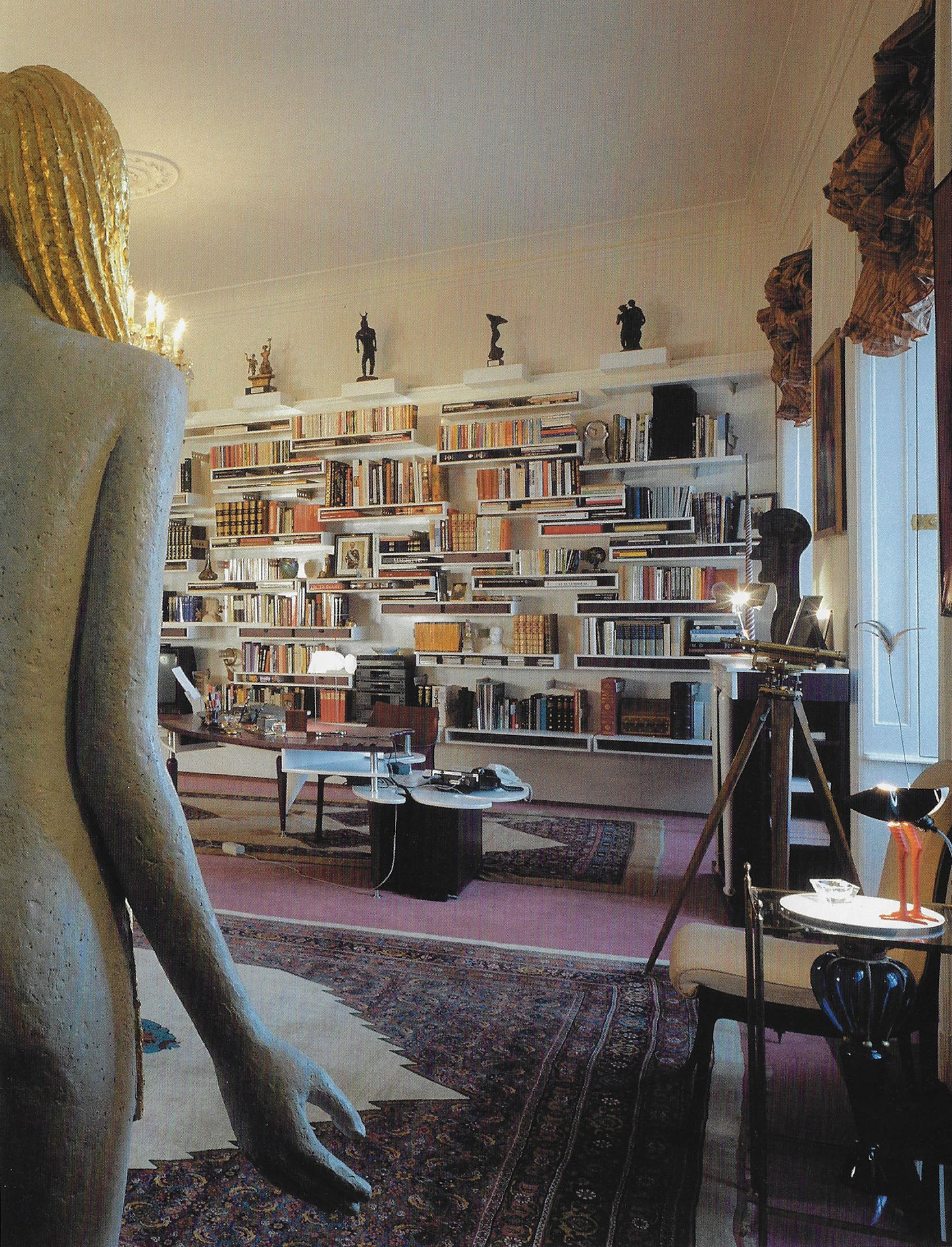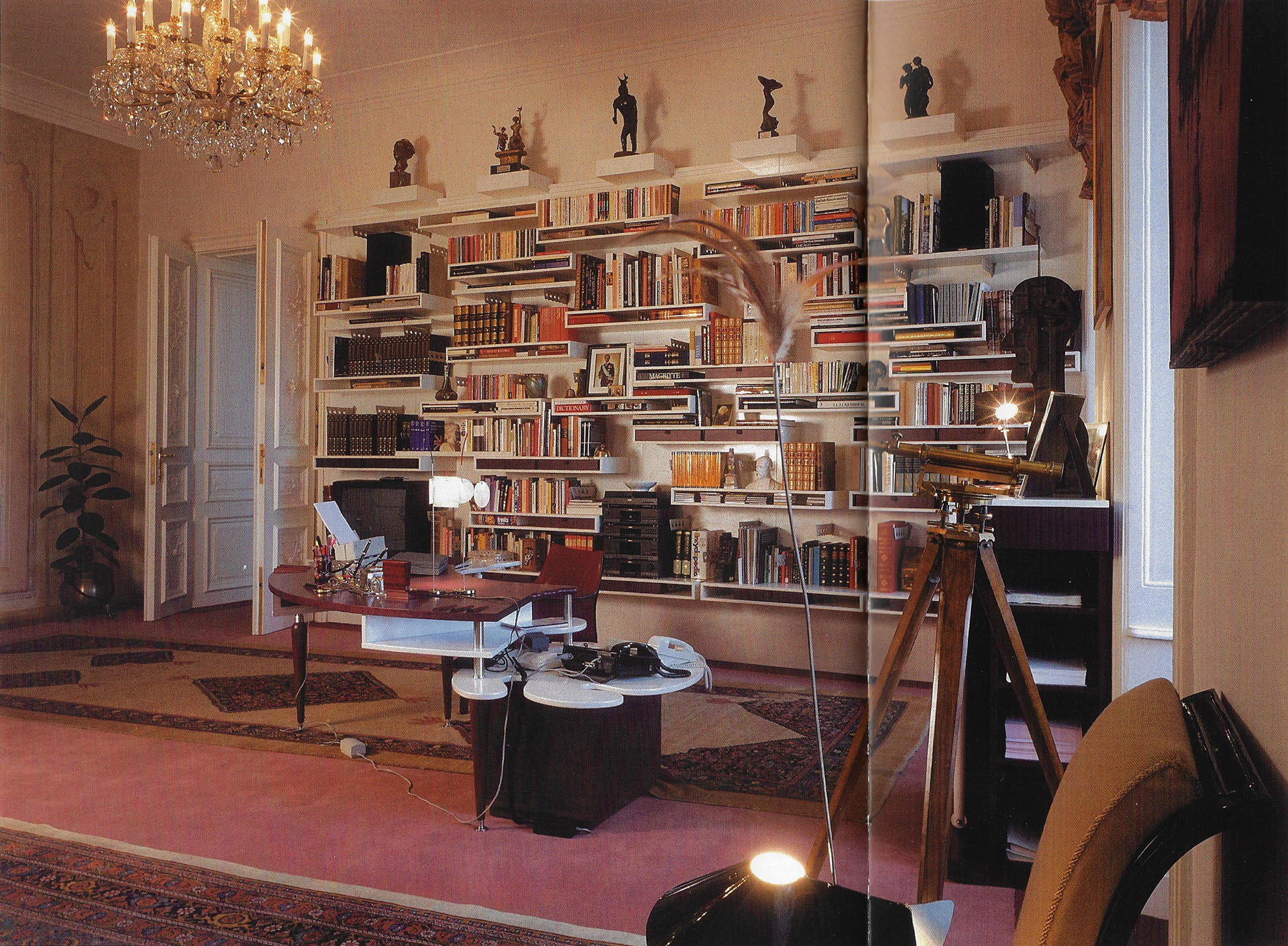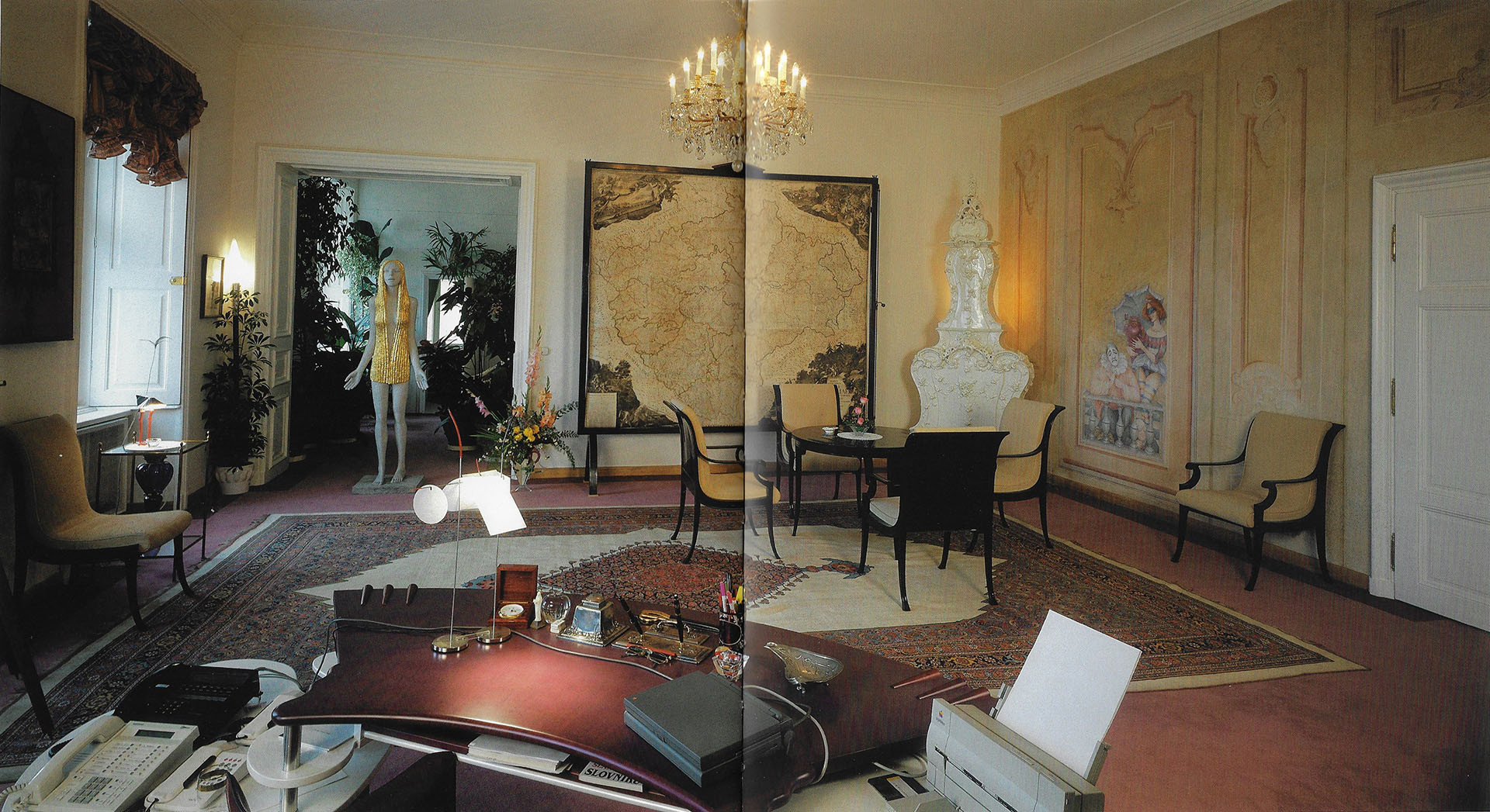 Jedna z realizací, kterou jsme si mohli prohlížet i o novoročních projevech, byla kancelář prezidenta republiky. Té dominovala knihovna, kterou tvořila asambláž knih, uměleckých děl, protokolárních předmětů a tehdejší elektroniky.