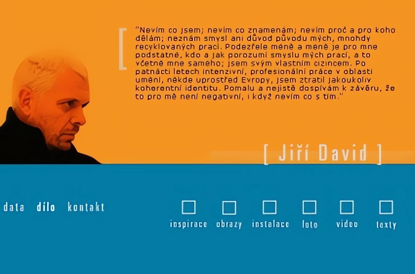 Co vede autora k těmto kontextuálním kreacím? Sám Jiří David se charakterizuje těmito slovy: "Nevím co jsem; nevím co znamenám; nevím proč a pro koho dělám; neznám smysl ani důvod původu mých, mnohdy recyklovaných prací. Podezřele méně a méně je pro mne podstatné, kdo a jak porozumí smyslu mých prací, a to včetně mne samého; jsem svým vlastním cizincem. Po patnácti letech intenzivní, profesionální práce v oblasti umění, někde uprostřed Evropy, jsem ztratil jakoukoliv koherentní identitu. Pomalu a nejistě dospívám k závěru, že to pro mě není negativní, i když nevím co s tím."