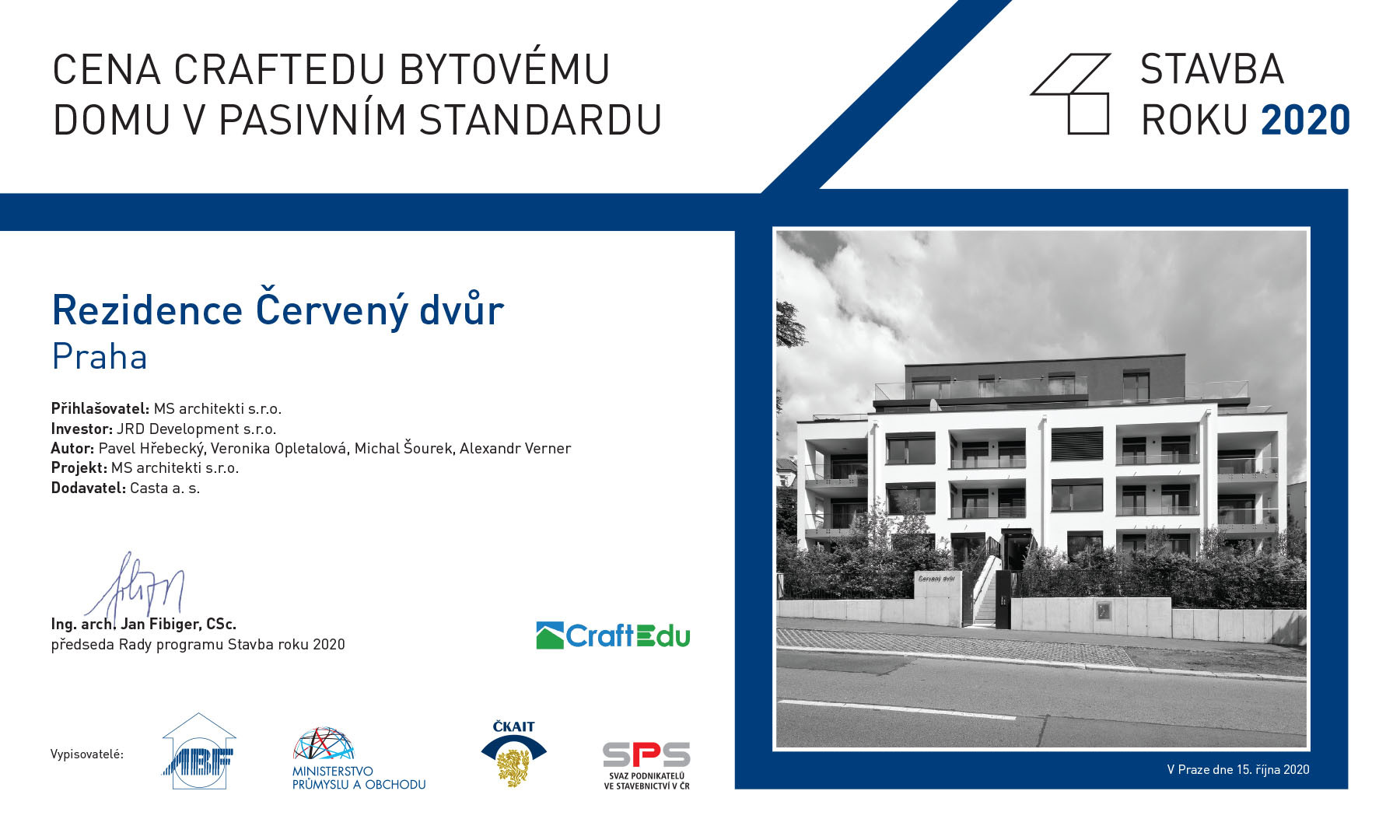 Prestižní cenu CraftEdu bytovému domu v pasivním standardu v soutěži Stavba roku 2020 získala Rezidence Červený dvůr od studia MS architekti