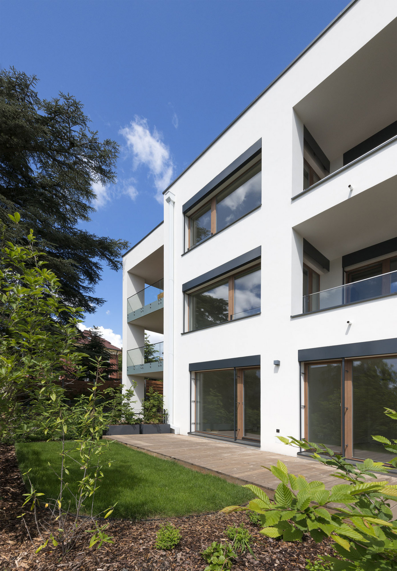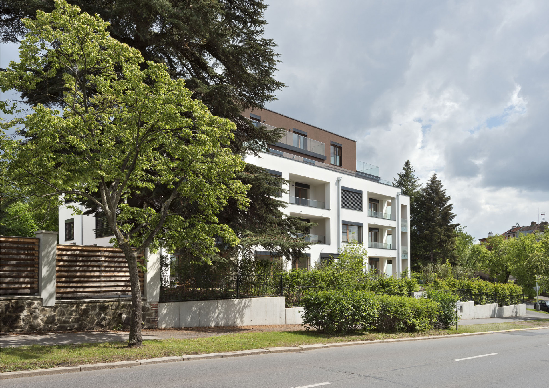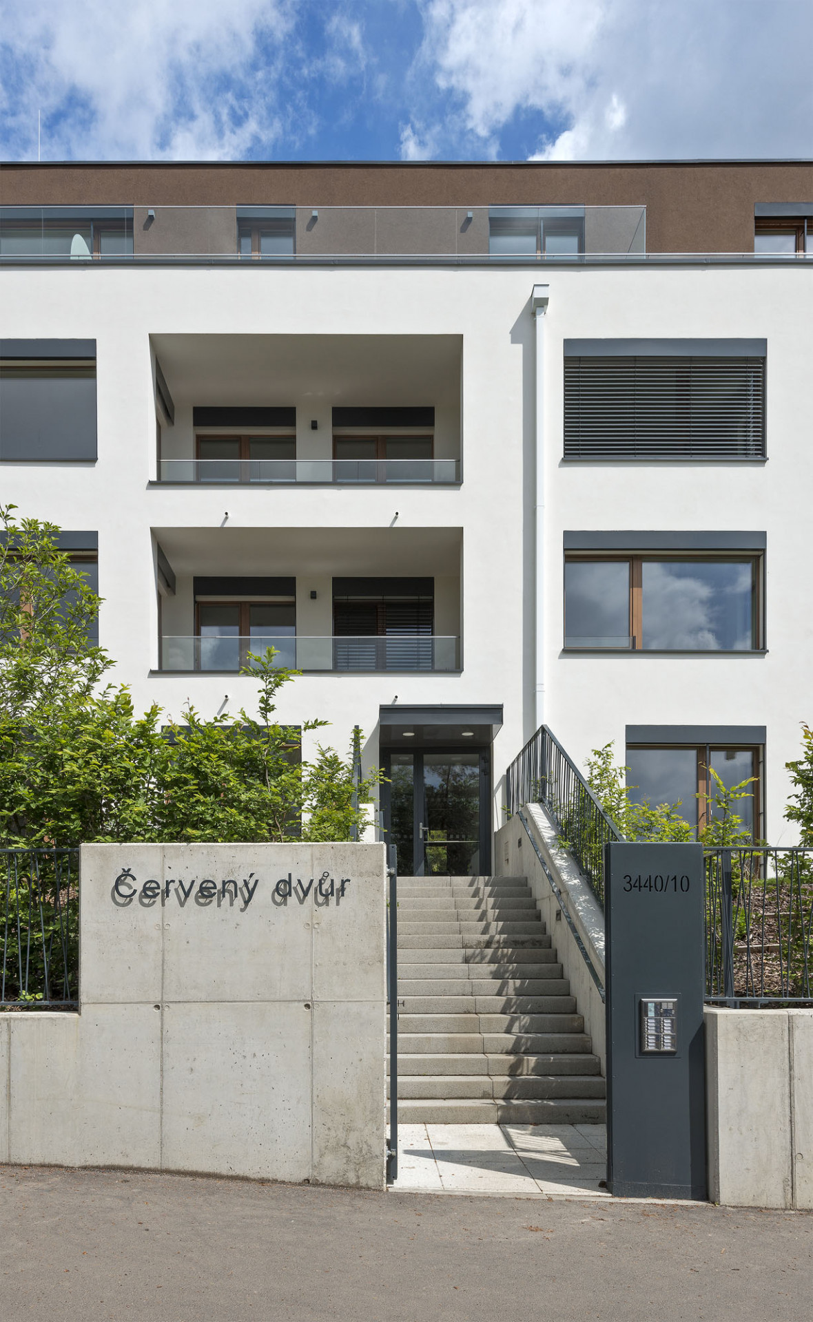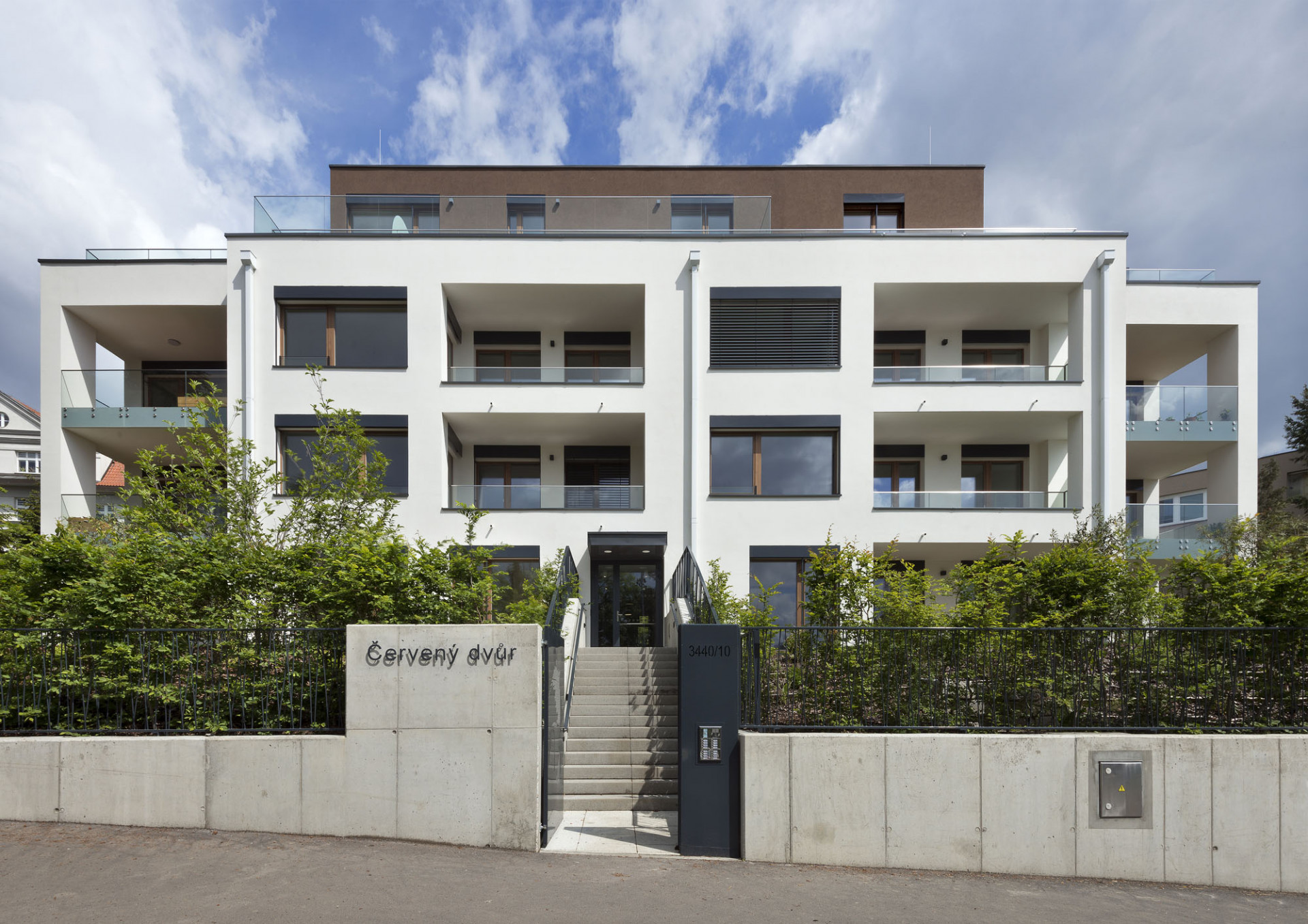 Architektura elegantní rezidence v prostředí prvorepublikových vil v pražských Strašnicích dotváří charakter lokality a kultivuje křižovatku Pod Třebešínem a K Červenému dvoru. Nízkoenergetická rezidence má tři kompaktní podlaží, na která navazují ustoupené čtvrté a páté patro s rozsáhlými terasami. Kolemjdoucího osloví svým elegantním, ale zároveň přívětivým výrazem. Tvarosloví rezidence podporuje barevné řešení fasád: ustoupená vrchní podlaží jsou oddělena tmavým odstínem hnědě barvy od celistvé, světlé hmoty prvních tří podlaží. Červený dvůr vyrůstá z rozmanité zahrady členěné na předzahrádky bytů v prvním nadzemním podlaží. Nejbližším sousedem rezidence je stoletý libanonský cedr připomínající dávno zaniklou původní barokní usedlost Červený dvůr, podle které nese název nová rezidence i celá lokality.