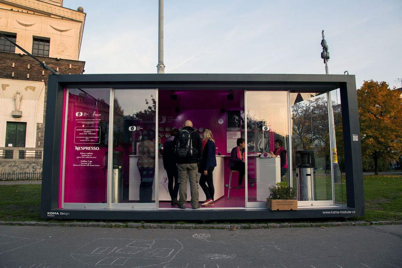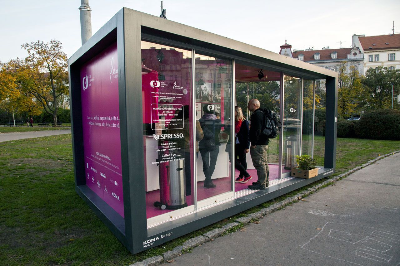 Šedo růžové CITY moduly ve veřejném prostoru zaujmou na první pohled. A nejde jen o modul, jehož prosklená stěna je plná ženských ňader a v jehož útrobách je sádrovna, kam každá žena může přijít nechat si odlít své poprsí a tím Alianci žen s rakovinou prsu podpořit. Na druhé straně chodníku stojí růžový modul, kde si kolemjdoucí mohou zakoupit například charitativní předmět s tématikou prevence rakoviny prsu (tzv. prsní hrnek s ňadrem na dně), placku s logem kampaně, tzv. růžové předměty, ale mohou si třeba koupit pouze kávu „to go“……. .Z prodeje všeho uvedeného jde výtěžek na podporu Aliance žen a jejího projektu Bellis – Young & Cancer.