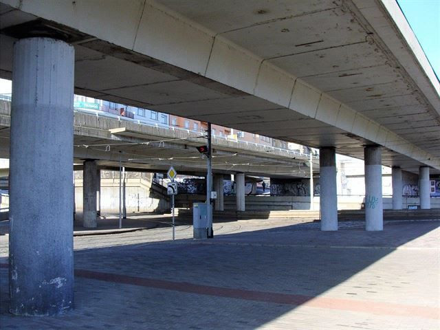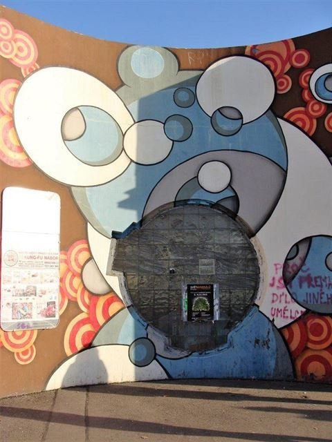 A pak už hurá do dosti depresívního labyrintu chodeb, schodišť, ramp a průchodů pod předpolím Hlávkova mostu ze 70. let. Je to nepřehledný útvar z pohledového betonu, v němž se nelze neztratit. Musíte pořád nahoru a dolů a nakonec vás to někde vyhodí – často jinde, než jste plánovali. Je to taková kafkovská totalitní záležitost s nepříliš příjemným odérem.
