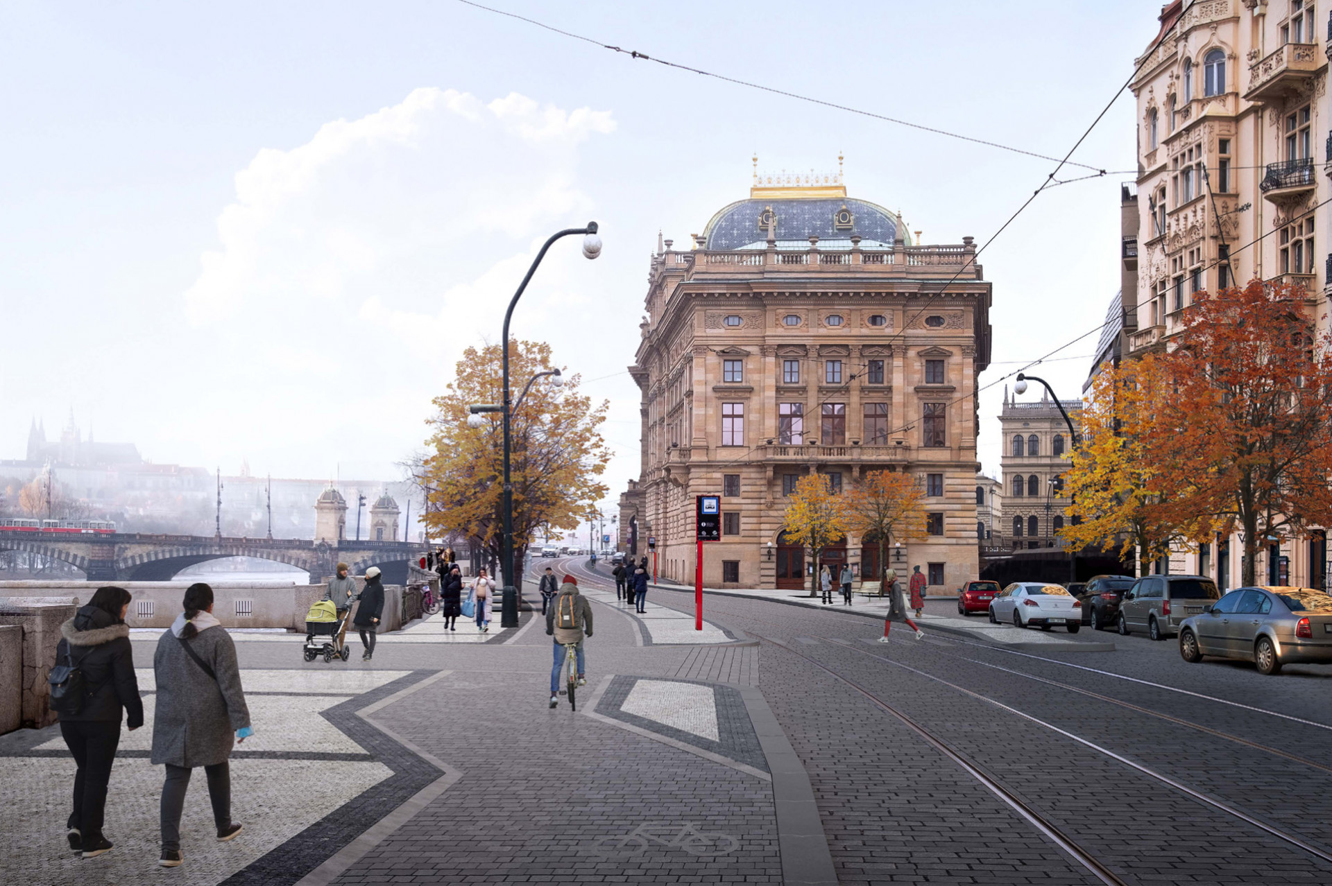 Současná koalice (Piráti, Praha sobě a Spojené síly pro Prahu – TOP 09 a STAN) chce trochu paradoxně dopravu v tomto místě zachovat a dojíždění autem do centra zjednodušit. Místo vyhrazení nábřeží pěším slibuje využití chytrých technologií k redukci dopravy: průjezd centrem bude hlídat kamerový systém s rozpoznáváním značek, který vyhodnotí, zda byl vjezd oprávněný. Oblastí budou moci projet pouze rezidenti, majitelé tamních provozoven nebo návštěvníci – pokud má řidič cíl na Praze 1, stačí si koupit parkovací lístek. Červenou dostane tranzitní doprava.