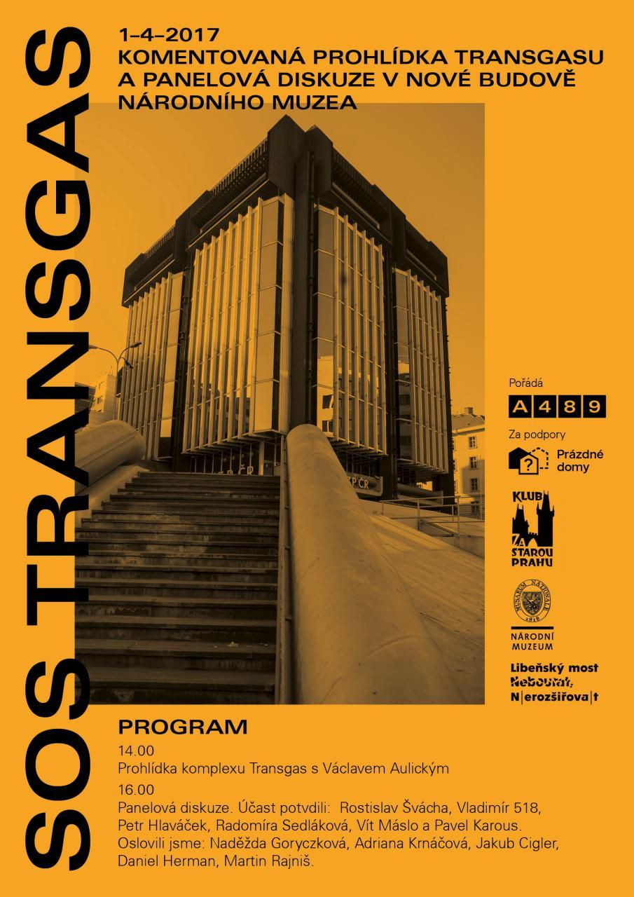 Spolek Architektura 489 ve spolupráci s Klubem Za starou Prahu, spolkem Prázdné domy, iniciativou Libeňský most nebourat, nerozšiřovat a s podporou Národního muzea, pořádá procházku areálem Transgasu komentovanou jediným žijícím architektem stavby Václavem Aulickým a následnou panelovou diskuzi ve velkém sále Nové budovy Národního muzea.