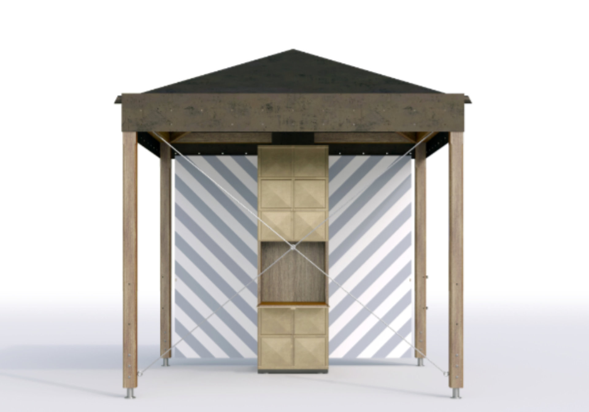 Vítězný návrh se vyznačuje subtilní konstrukcí i vysokou funkčností. Přístřešky budou chránit před sluncem i deštěm, lze je snadno přemístit, libovolně redukovat nebo rozšiřovat o přídavné moduly.