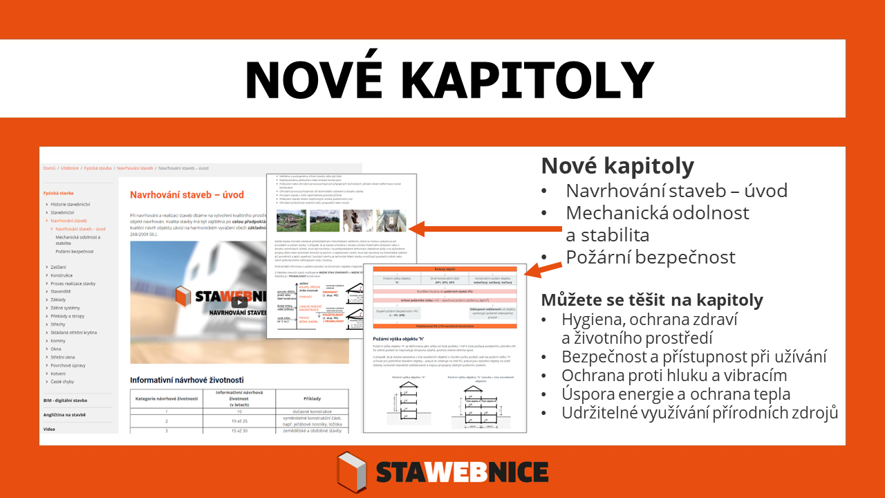 Interaktivní příručka prochází neustálou aktualizací. Nedávno do ní přibyly třeba nové kapitoly o navrhování staveb, mechanické odolnosti a stabilitě nebo požární bezpečnosti. Na webu se ale dočtete také o historii stavebnictví, procesu realizace, častých chybách na stavbě a mnohém dalším. Praktická je také sekce věnovaná digitálním modelům stavby. BIM, z anglického „Building Information Management“, představuje komplexní proces vytváření a správy dat o stavbě během celého jejího životního cyklu. V rámci metody BIM vzniká celkový informační model stavby, její digitální dvojče, který slouží jako otevřená databáze informací o stavbě pro její návrh, provádění, užívání a provozování a vzájemné propojení těchto etap. Praktickou novinkou na Stawebnici je také sekce stavební angličtiny pro rozšíření slovní zásoby a zvládnutí gramatiky.