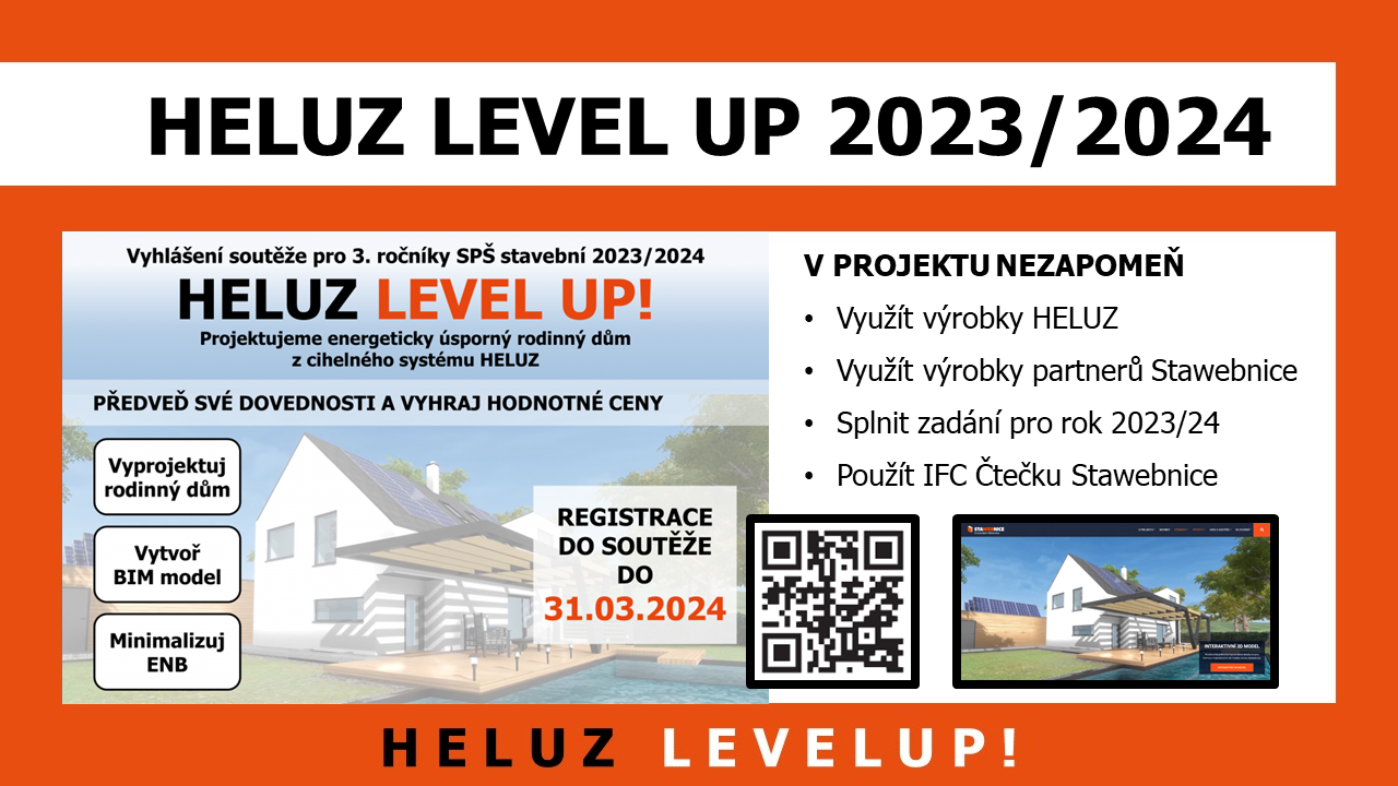 Propojení Stawebnice a soutěže HELUZ LEVEL UP bude pokračovat i v dalším ročníku, do toho je možné se registrovat od nynějška do 31.3.2024. Půjde o třetí ročník soutěže, který si znovu klade za cíl podporu energeticky efektivního a konstrukčně kvalitního stavitelství v České republice a na Slovensku.
