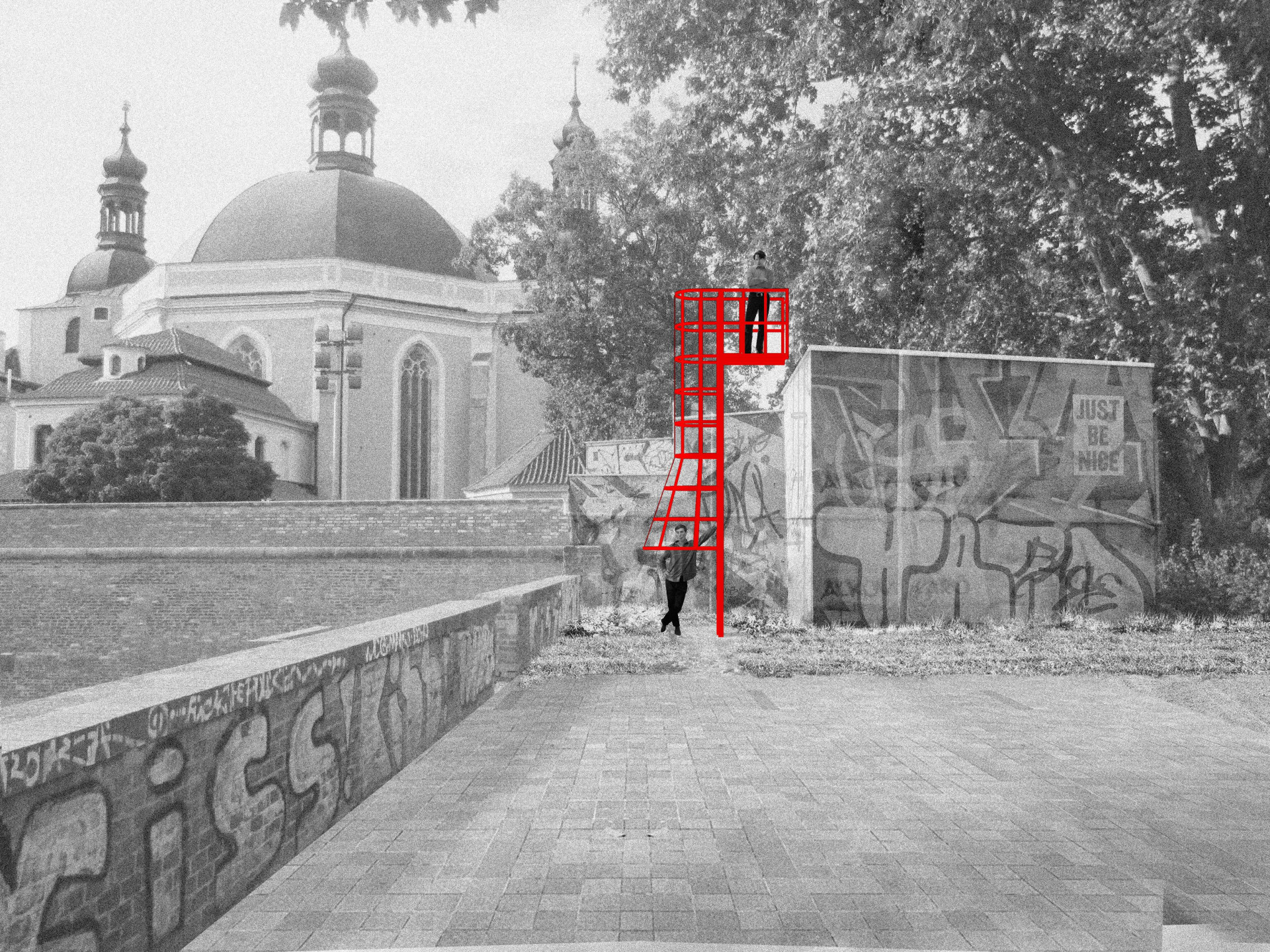 Ondra: Mě docela baví provokovat. Třeba když jsme dělali soutěž na výtvarný prvek do parku na Karlově, snažili jsme se poukázat na stavbu trafostanice, která byla úplně vynechána ze zadání. Přitom je svou polohou jedním z těžišť parku a zároveň její střecha nabízí super výhled na Prahu. A tak jsme se rozhodli s touhle stavbou pracovat a dát jí v rámci parku nějaký smysl. Doplnili jsme ji o celkem banální prvek – červený údržbový žebřík s ochranným košem, který by návštěvníkům parku umožnil nevšední zážitek. Taky vybízel k „lehkému vandalismu“, protože by usnadnil přístup na střechu stavby patřící Muzeu policie ČR, a tak jsme tušili, že moc šancí k výhře nemáme.