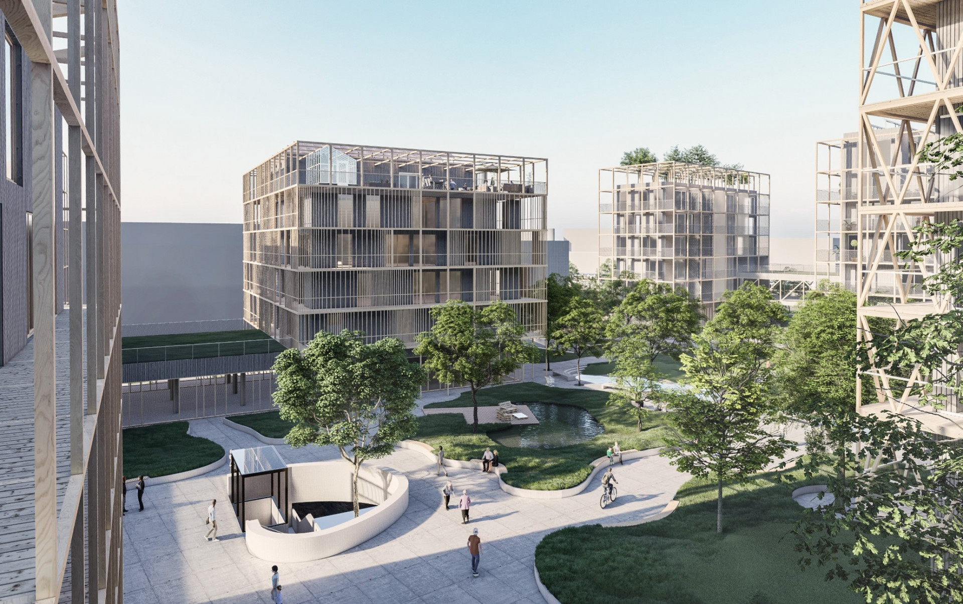 Kristýna Klůsová s Jiřím Petrželkou se rozhodli zasadit momentálně odříznuté a mrtvé území do sítě městských parků v Paříži a zpřístupnit oblast přeměnou brownfieldů v městskou zástavbu. Do návrhu zahrnuli i nové dopravní a pěší spojení a také zelené mosty přes řeku a železnici. Kompozici tvoří promísení funkční náplně prostor, komunitní a komerční prostory v přízemí, variabilně užitná veřejná prostranství a kulturní stavby s celodenním využitím. Vznikl tak bohatý a bezpečný městský prostor, plný živých průhledů se zacílením na společenskou interakci obyvatel. Studenti přitom brali v potaz i uhlíkovou stopu - rozhodli se využít materiály na bázi dřeva jako hlavní konstrukční materiál a cíleně použít přírodní a recyklované materiály od místních firem a dodavatelů. Betonové konstrukce byly navrženy pouze v prvním nadzemním podlaží a komunikačních jádrech jako odkaz na historickou tradici místa a k zajištění požární bezpečnosti staveb. Díky mírnější požární normě ve Francii jsou podlažní objekty navrženy z přiznaných CLT panelů. Tepelného komfortu a kvalitního vnitřní prostředí se dosáhlo kvalitními tepelně izolačními vlastnostmi obálky budov a řešením všech klíčových detailů. Vytápění a ohřev vody zajišťují obnovitelné zdroje energie a díky recyklaci šedé vody je docíleno 40% úspory pitné vody z vodovodního řádu. Dešťová voda je akumulována ve veřejných vodních prvcích nebo na zelených střechách a slouží k ochlazení a zlepšení mikroklimatu v celé oblasti. Vyprodukovaná elektrická energie je využita přímo v budovách, nebo akumulována v bateriovém úložišti. Energie je sdílena pomocí smart grid sítě mezi objekty s rozdílnou denní špičkou. Výsledkem celého návrhu jsou budovy v pasivním standardu a možnou soběstačností.