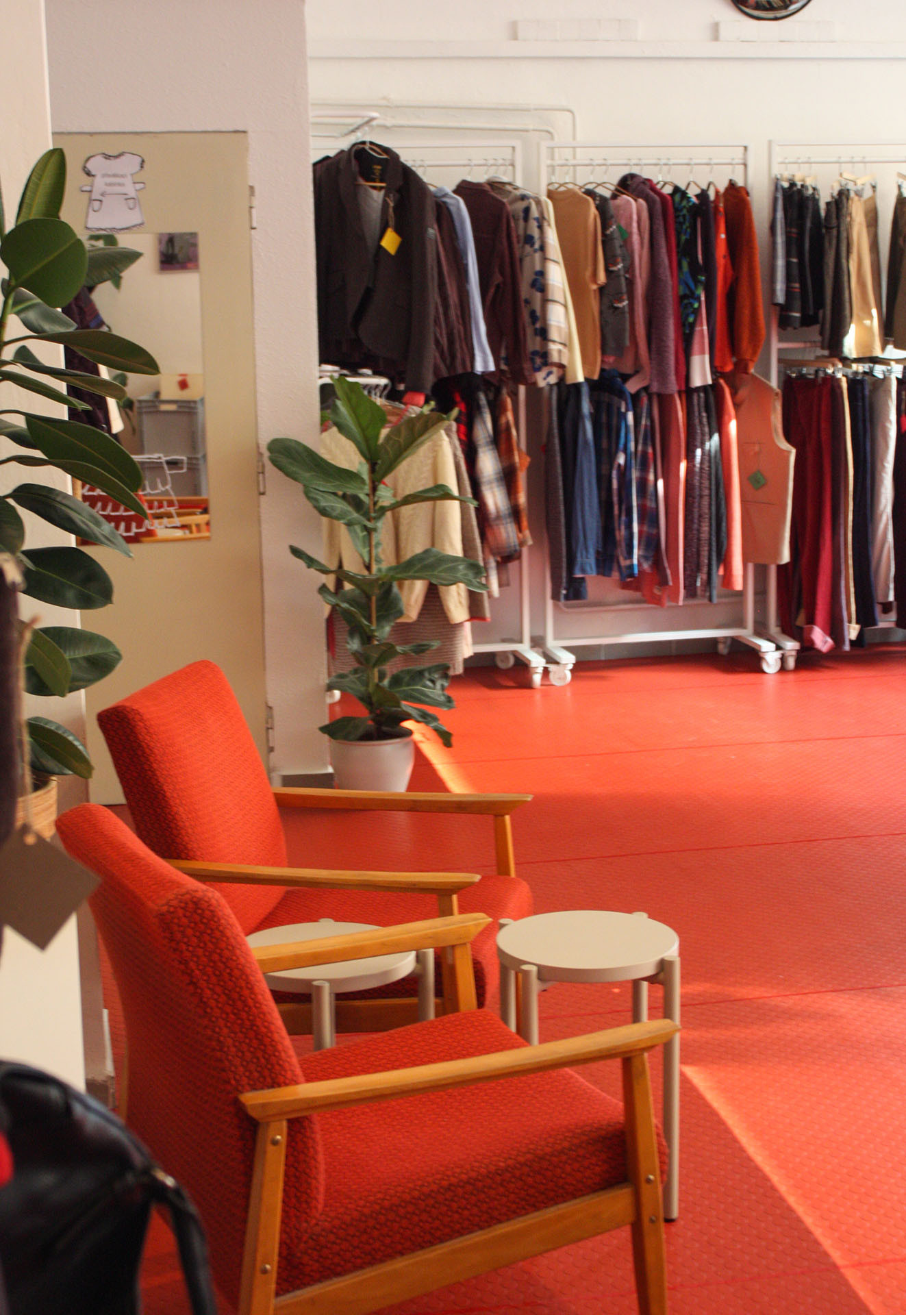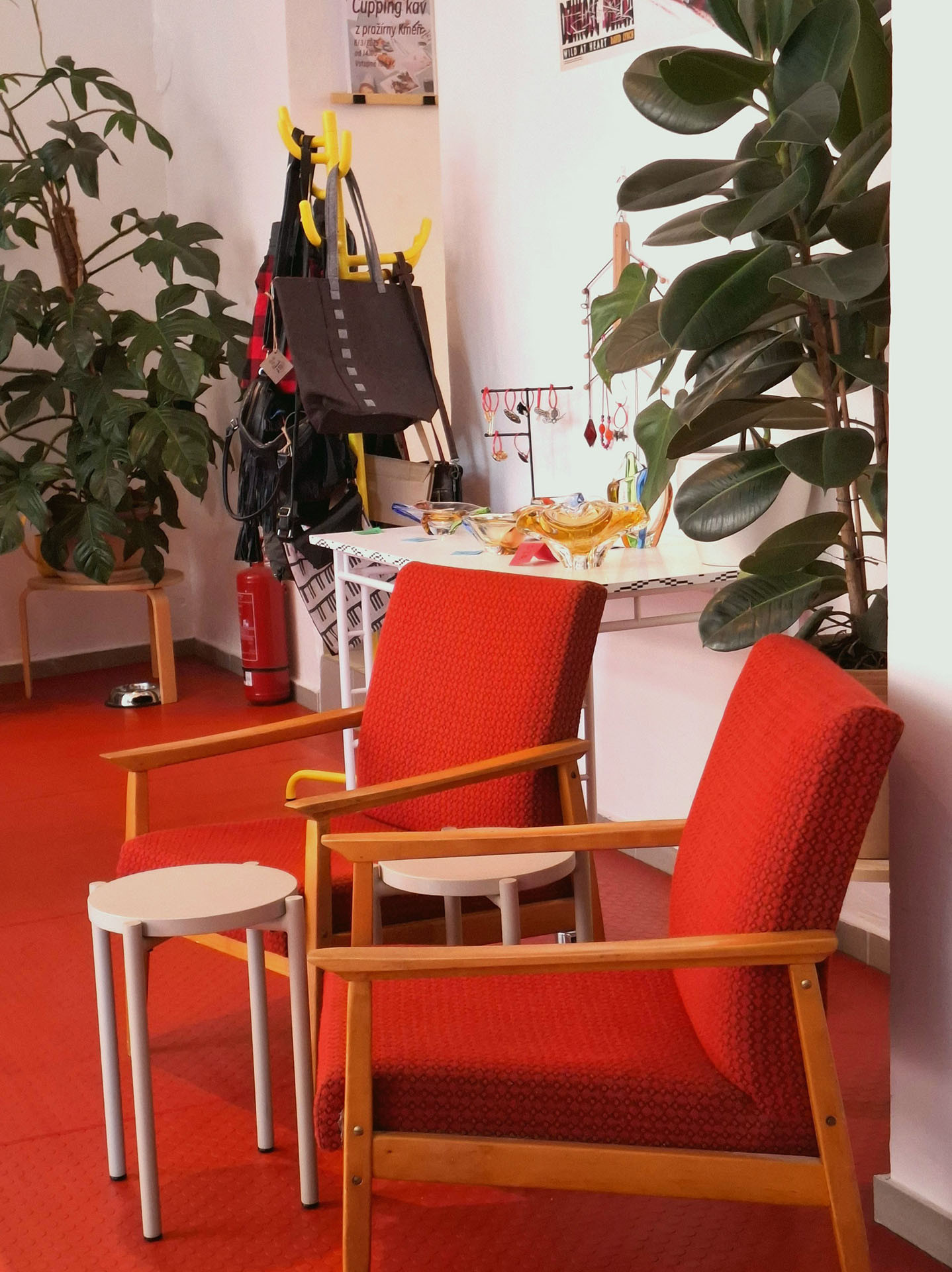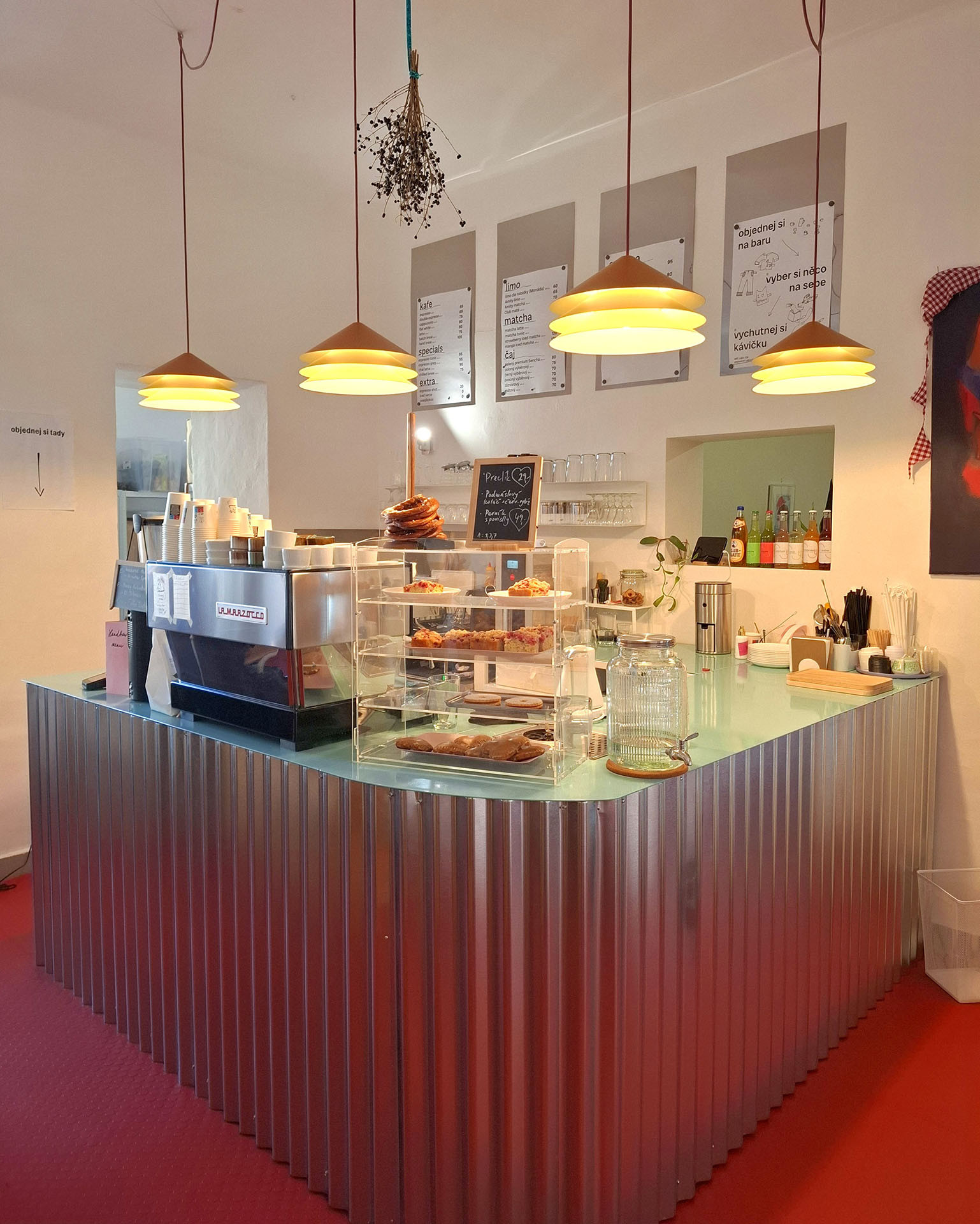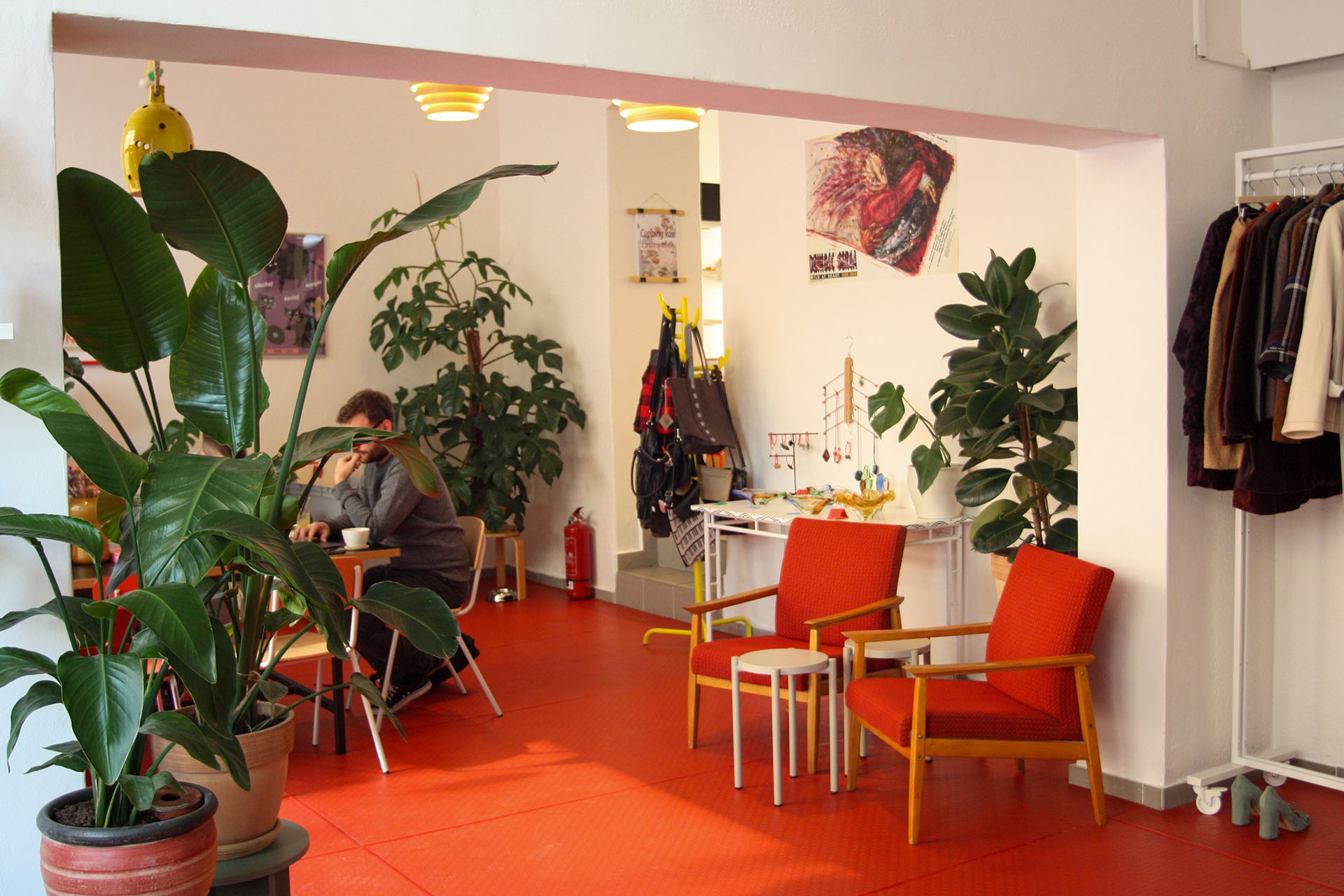 Hlavní hvězdou designového řešení je podlaha v červené barvě. Zdi, police a věšáky se drží čistě bílé a nechávají vyniknout vystaveným vintage kouskům, zeleným pokojovkám a retro nábytku. Jeden velký stůl jako středobod vstupní části kavárny působí netypicky ale přátelsky, v místnosti napravo převládají věšáky s oblečením, které si můžete vyzkoušet v kabince v přilehlém “pokojíčku”. Nejdůležitějším místem kavárny je samozřejmě bar – obložený vlnitým plechem, který odráží všudypřítomnou červenou podlahu.