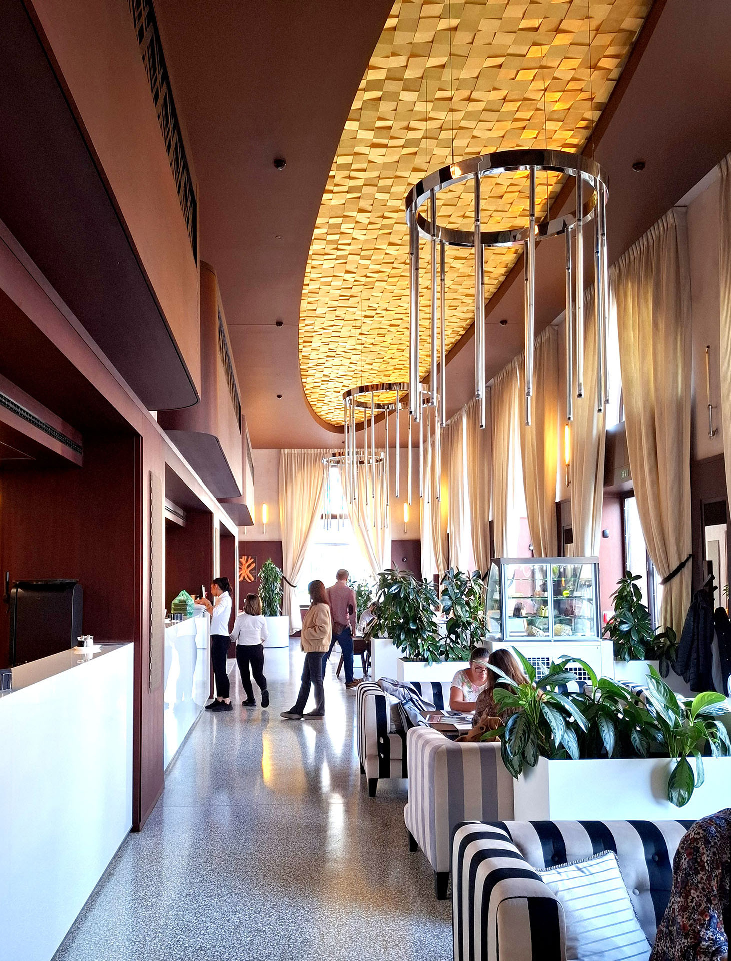 Kavárnu tvoří sál s vysokým stropem a obloukovými okny, do kterého se z boku otevírají vyřezávané balkony v mezipatře – toto rozvržení přetrvalo ještě z prvorepublikového podniku. Jinak se však nejedná o původní interiér, všechny prvky jsou minulostí pouze inspirovány. Při vstupu vás ihned zaujme strop s velkolepou zlatou mozaikou, který sjednocuje celý prostor. Kovové lustry evokují dvacátá léta a spolu se závěsy podporují vertikální dojem hlavního sálu. Bar s dřevěným obložením je umístěn pod balkony. Kavárna je vybavena elegantním nábytkem české značky Formdesign. Bohémskou atmosféru jí dodávají obrazy na zdech vypůjčené z Ostravské galerie výtvarného umění. Kavárna dnes patří J&T bance, která ji mimo jiné využívá pro menší pracovní schůzky.