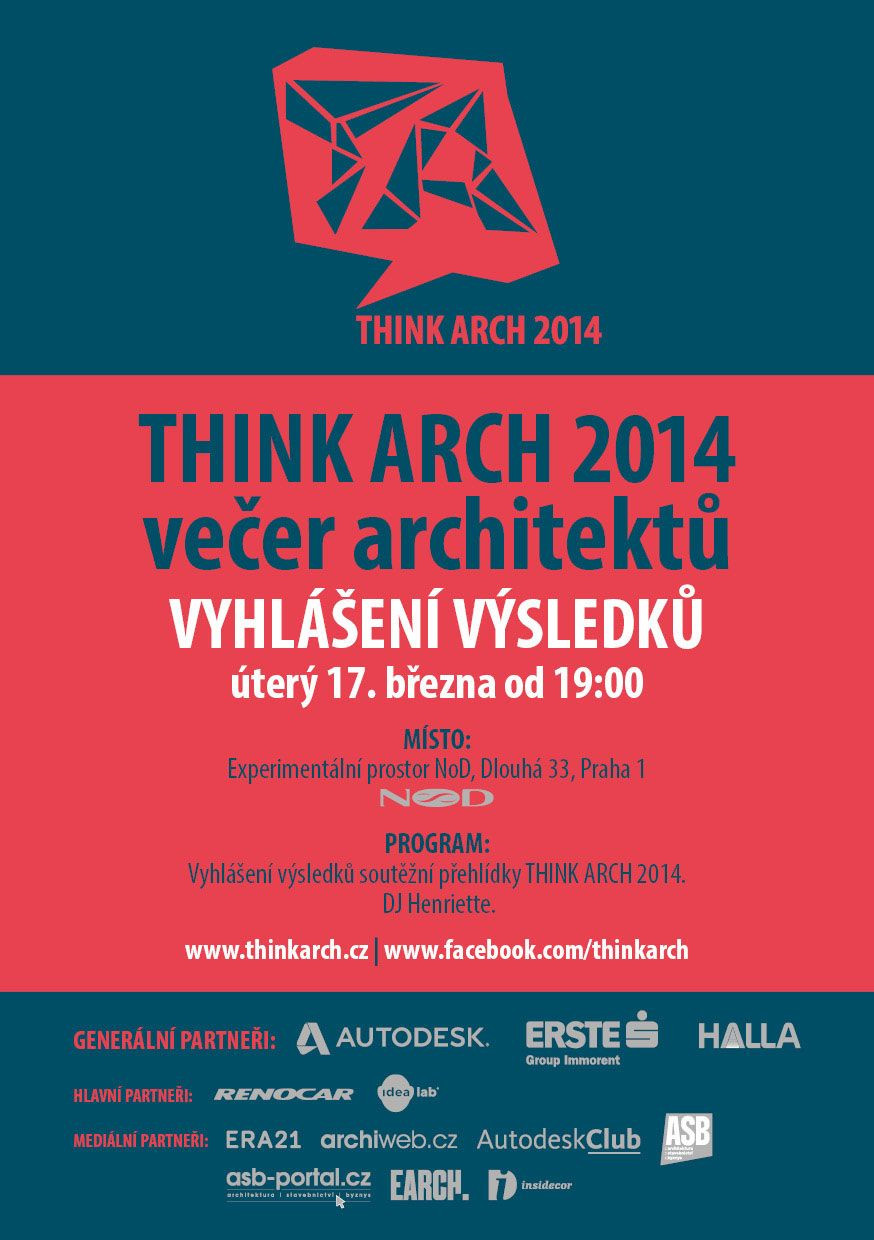 Slavnostní vyhlášení výsledků přehlídky THINK ARCH 2014 se uskuteční již příští úterý 17. března 2015 od 19 hodin v pražském klubu Experimentální prostor NoD, Dlouhá 33, Praha 1.
