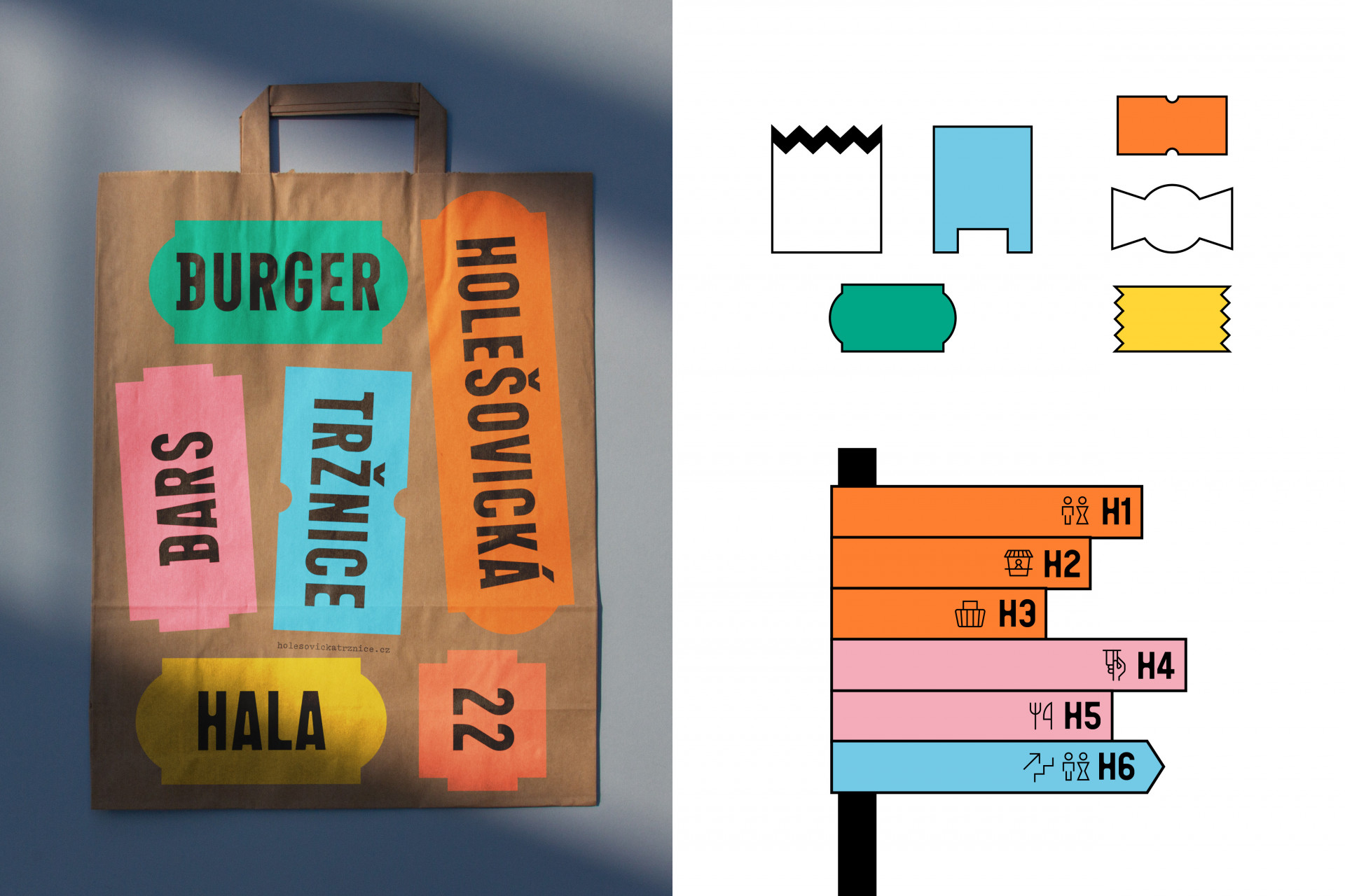 „Koncept vizuální identity Holešovické tržnice definujeme jako ozvuk tradice lidového, nejen obchodního, ale také kulturního, společenského a kulinářského života. Vidíme v tržnici možnost setkávat se a na jednom místě zažívat rozličné zážitky. I proto jsme zvolili v návaznosti na různé ‚zóny‘, které se v tržnici vyskytují, širokou škálu a možné využití barev. Pražská, resp. Holešovická tržnice je jakýmsi ‚městem ve městě‘ a s touto základní myšlenkou jsme i uvažovali nad celým grafickým řešením,“ popisují koncept autoři.