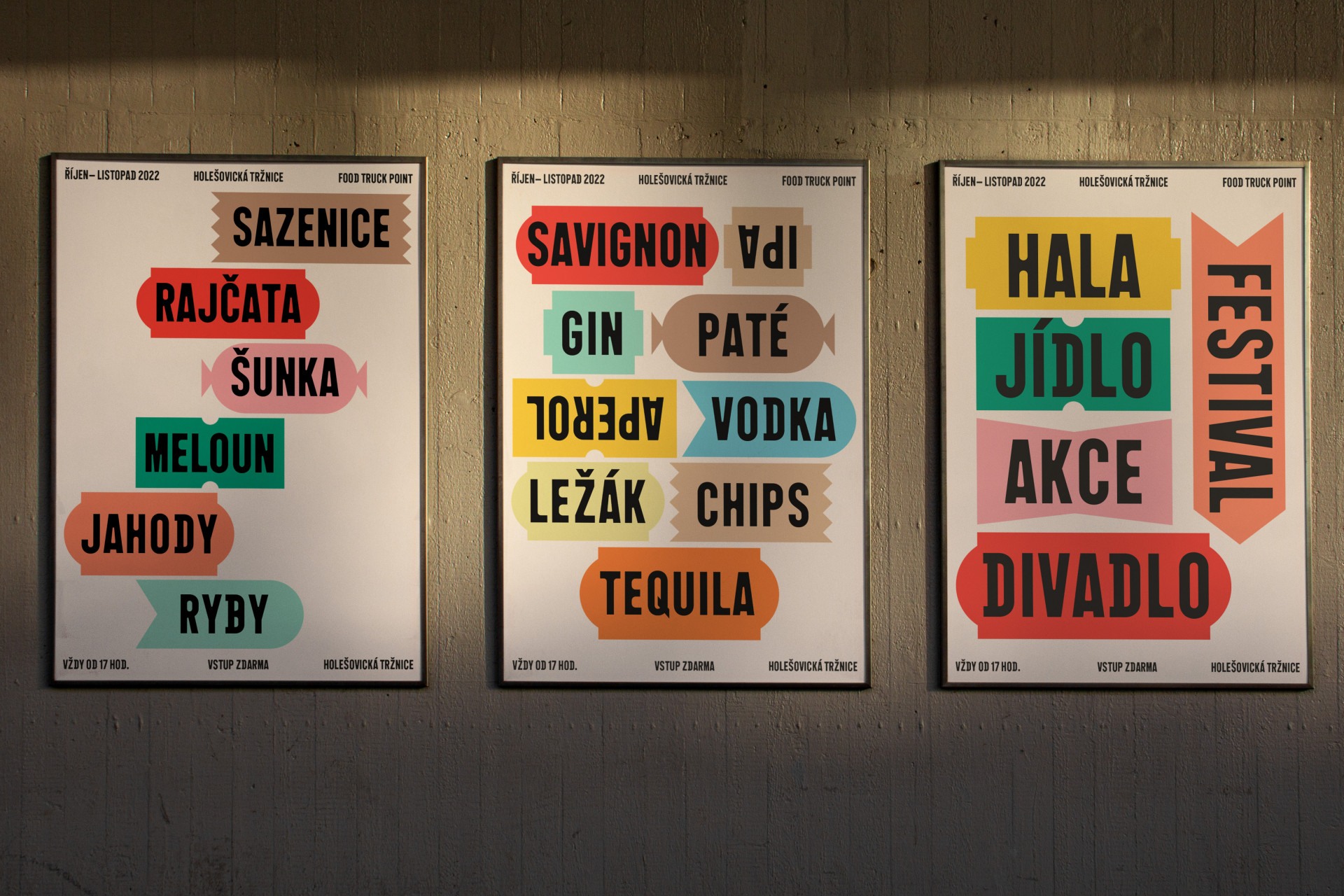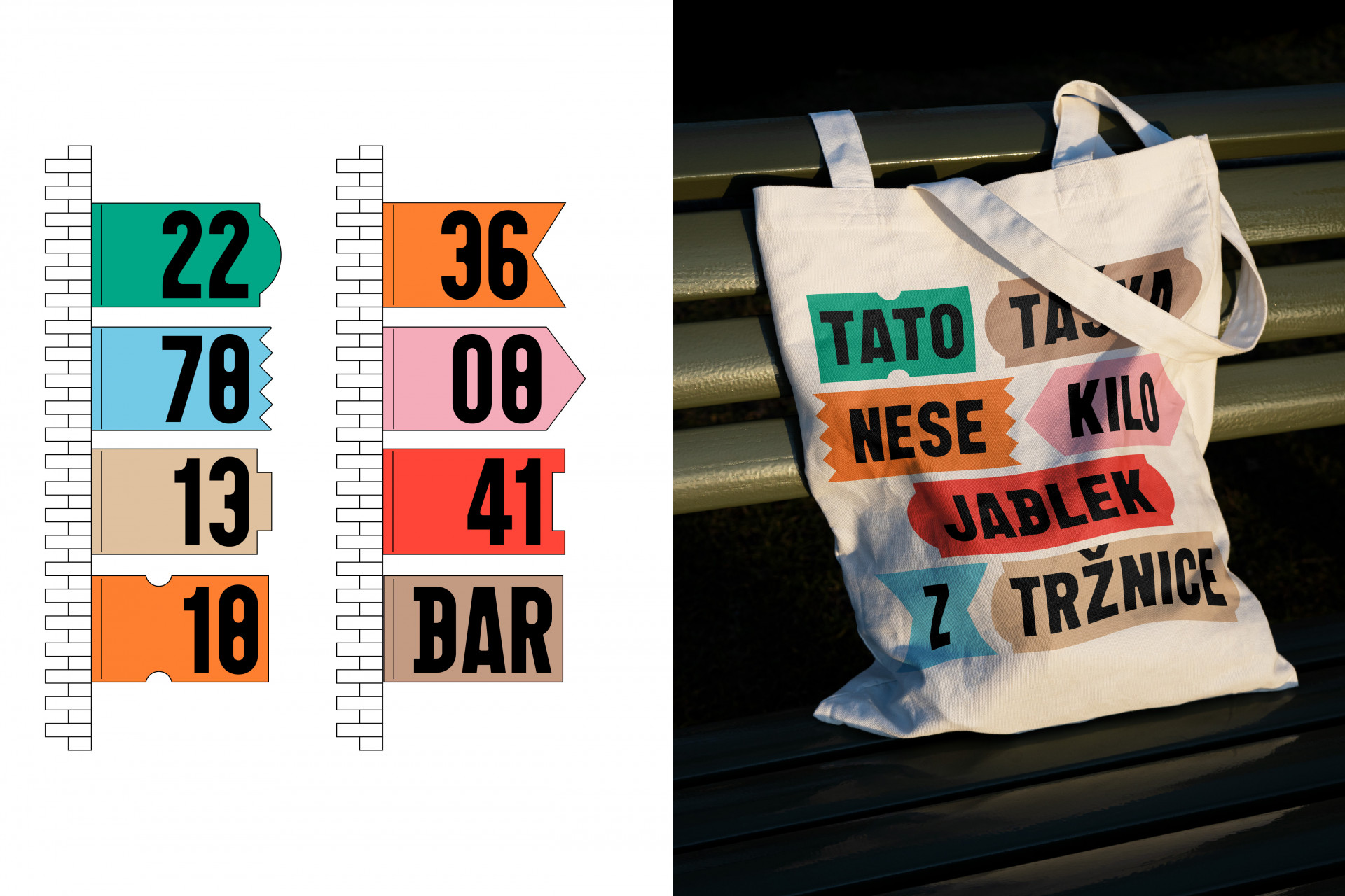 Vybrané písmo Animo (od české písmolijny Heavyweight) a grafické motivy odkazují na typické architektonické prvky tržnice, ale také na typickou estetiku prodejních míst – cenovky, vývěsní štíty, ukazatele nebo tabule. Ty mohou také evokovat ruch a rozmanitost trhového prostranství.