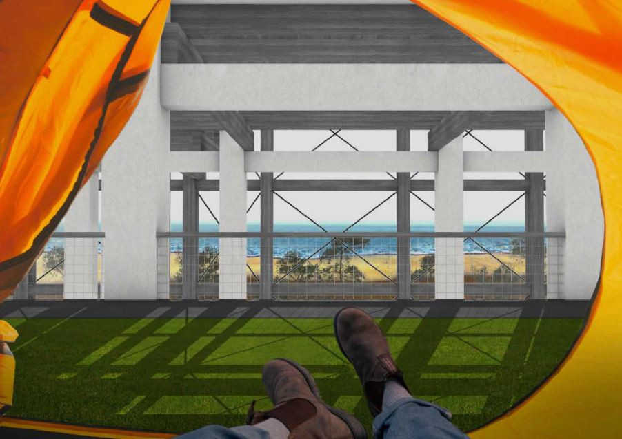 Stavba Tomáše Müllera bude v létě sloužit jako kemp s exkluzivními výhledy na moře. V zimě reaguje na fenomén ptačí migrace, kdy se tento kemp stane zimovištěm pro ptactvo ze severských zemí Skandinávie. „Tvar stavby se podřizuje potřebám jednotlivých uživatelů stavby, pro ptactvo vytváří vhodné podmínky pro pobyt v průběhu zimy a pro návštěvníky pak vytváří příjemné prostředí v letních měsících. Zvolený program stavby reaguje na skutečnost, že se má v nejbližší době rušit městský kemp a tak do lokality navrací tento typ ubytování a přináší do místa nové možnosti“, doplňuje autor projektu.