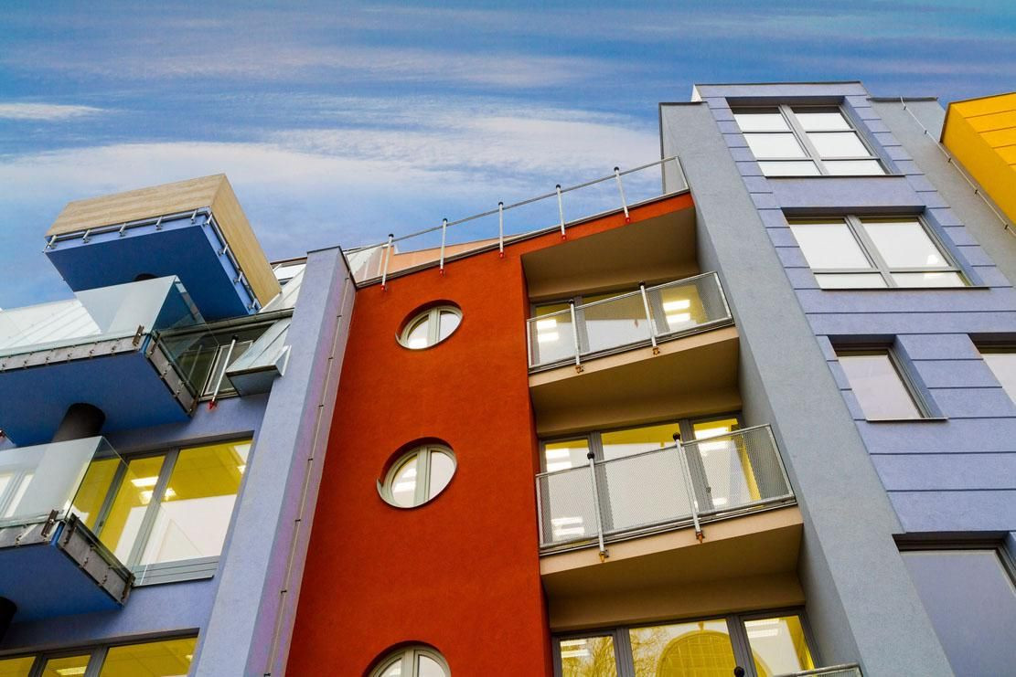 Fasáda budovy vytváří iluzi pěti navzájem nezávislých bytových domů, jednotlivé patra interiéru jsou však vzájemně zcela provázaná a tvoří otevřenou variabilní plochu. Dílčí části domu se navzájem odlišují barevným provedením v teplých tónech, které lokalitu celkově rozzářily. Zároveň vynikají různými dekorativními prvky a jsou vybavené balkóny, lodžiemi a terasami. Balkóny jsou doplněné o skleněné elementy z dílny Bořka Šípka speciálně navržené pro tuto stavbu. Terasy ozvláštňují fasádní průhledy vytvořené z pohledového betonu. Spodní část fasády je tvořena obkladem z řeckého travertinu.