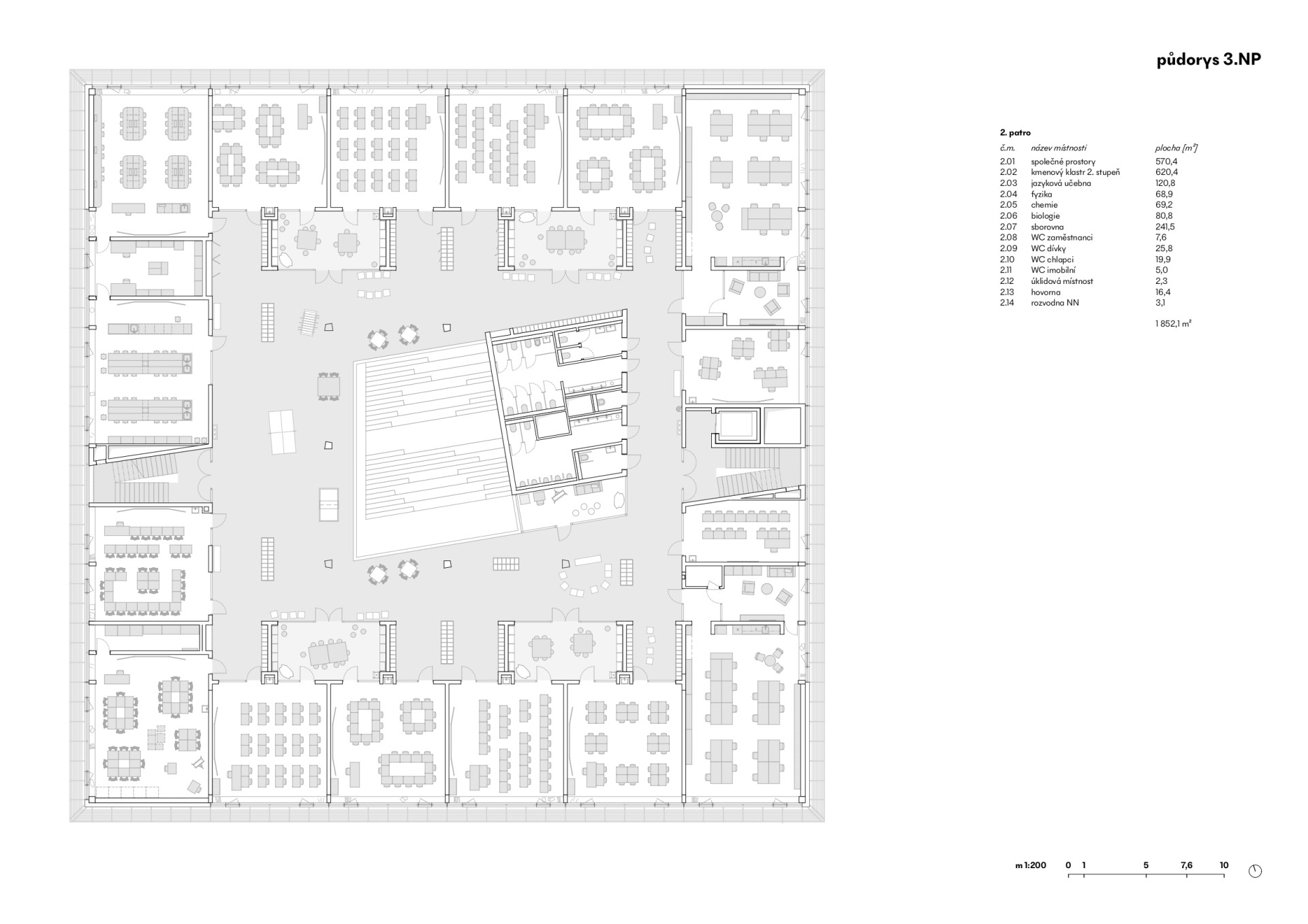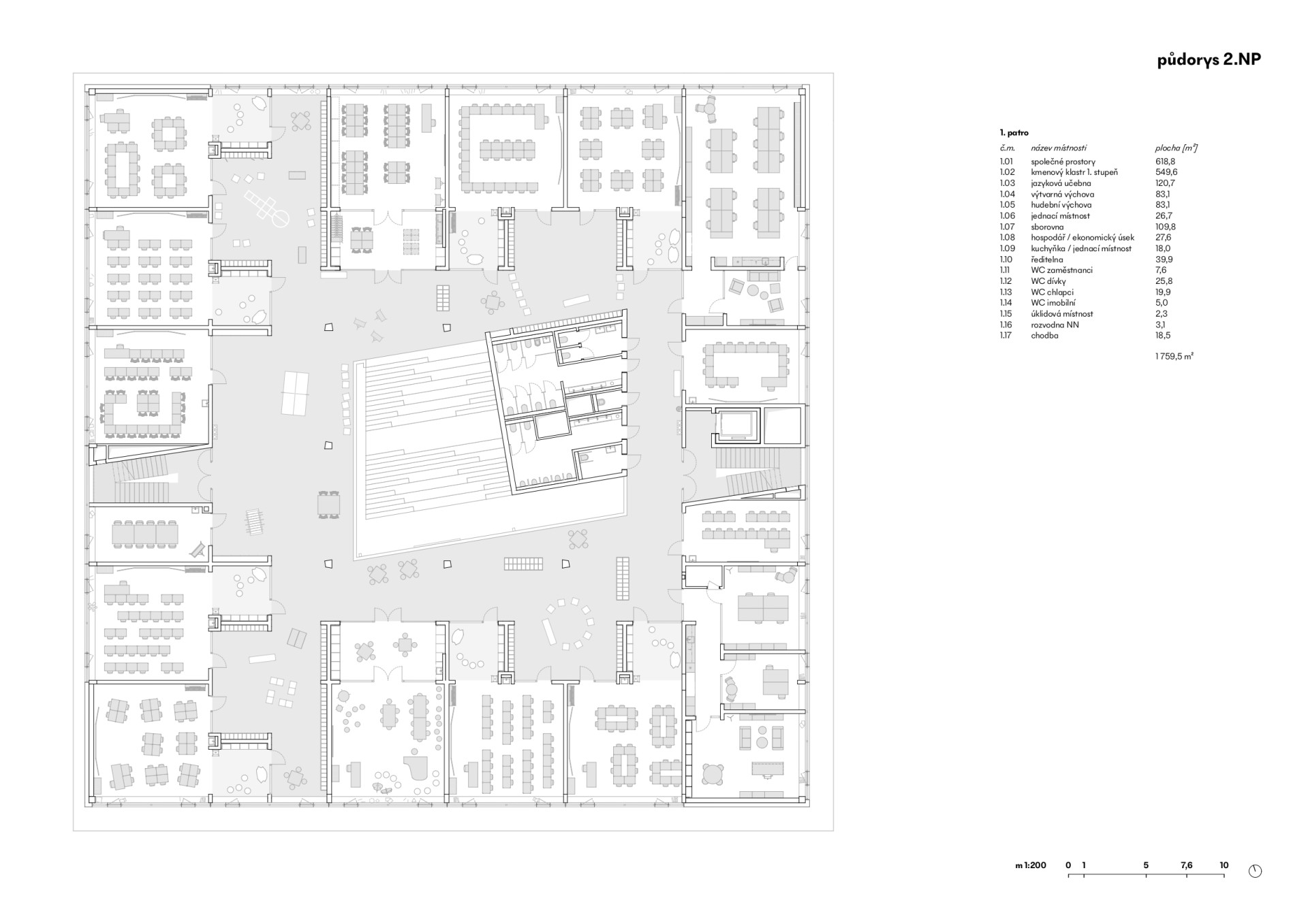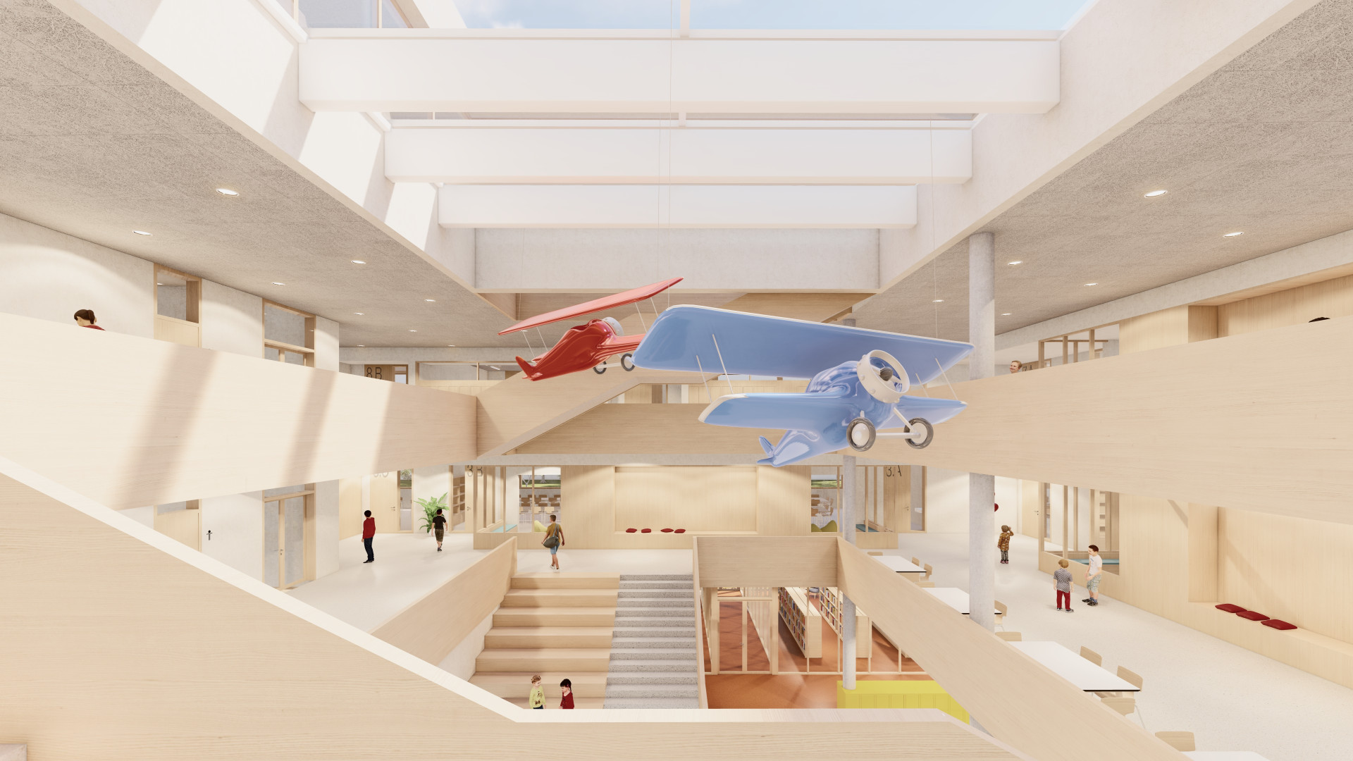 Pro větší děti však architekti uplatnili trend spíše opačný: cílem je ve škole mít co nejméně izolovaných místností a naopak co nejvíce otevřených a variabilních prostor. V ZŠ Jana Vodňanského proto budou první třídy jako jediné v přízemí, zatímco vyšší ročníky se rozdělí do pater s tzv. klastrovou koncepcí. To znamená, že vždy ke dvěma kmenovým třídám přilehne jeden společný „záliv“, který může sloužit jako místo pro setkávání o přestávkách, ale lze ho využít i pro rozšíření výuky. Třídy se taky přes klastr plynule propojují s chodbami, které se dál otevřou do čtvercového atria uprostřed školy. Zabrání se tak vzniku úzkých a tmavých koridorů.
