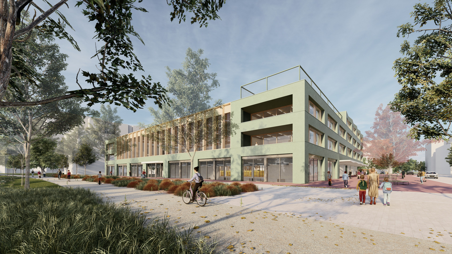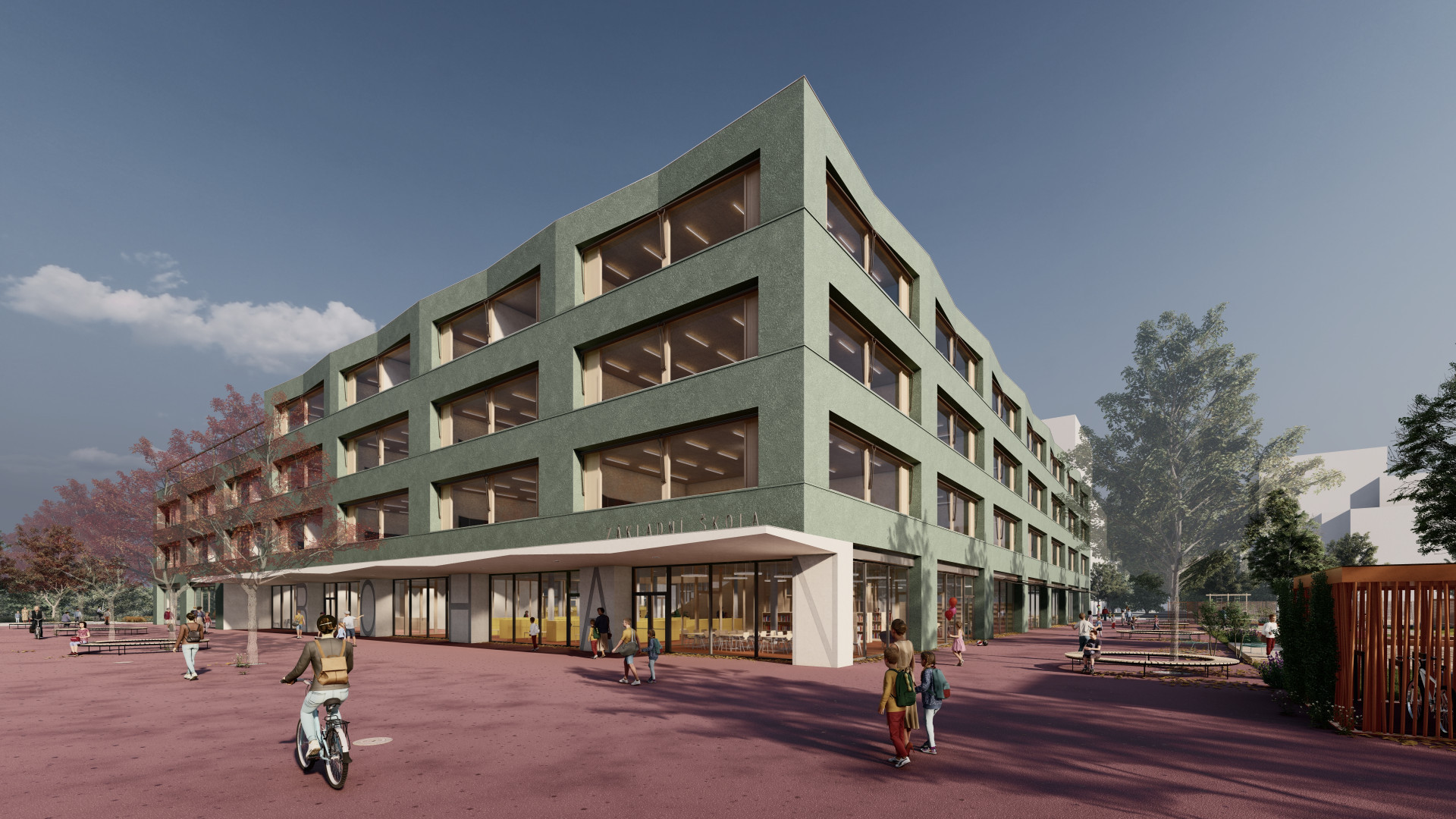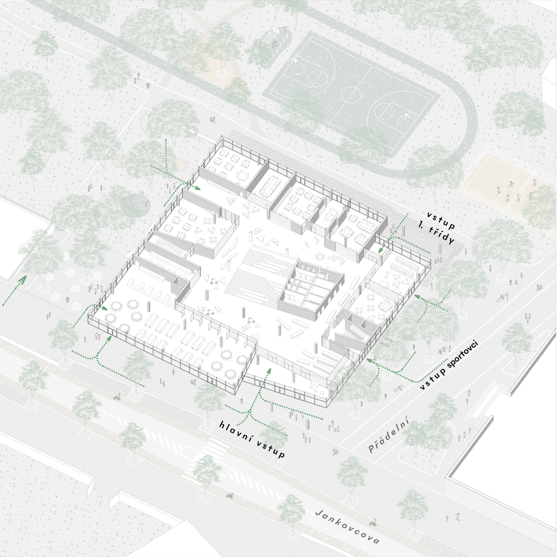 ZŠ Jana Vodňanského bude stát na parcele v Jankovcově ulici kousek od holešovického přístavu a jedním z jejích specifik je, že se bude dát skoro celá obejít – tedy bude přímou součástí čtvrti, ploty se okolo nepostaví. Zapojování škol do veřejného prostoru je dalším z aktuálních trendů, který navíc budovy pomáhá začlenit do života čtvrti a podporuje jejich využitelnost i v době mimo výuku.