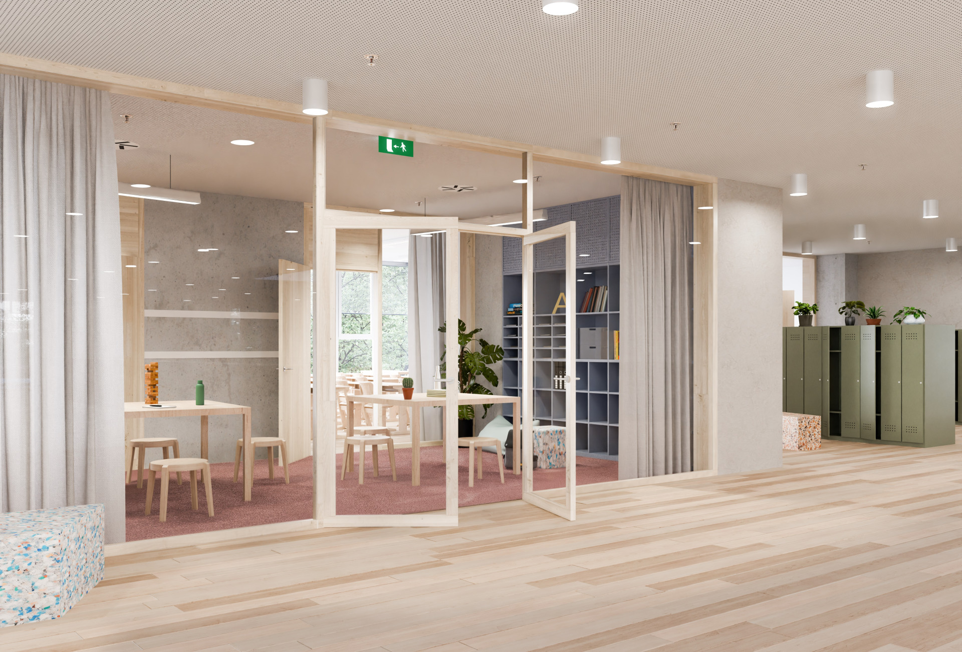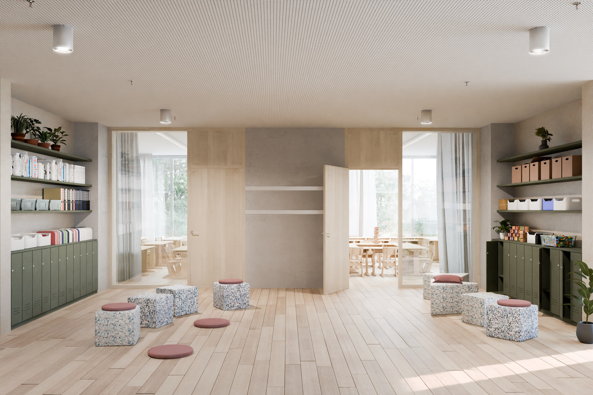Podobně tomu bude i v MŠ Jeseniova na Praze 3. Architekti sem navrhují multifunkční chodby širší než ty běžné, takže poslouží nejen jako komunikace, ale i pro kroužky nebo jednorázové aktivity. Samotné třídy budou dlouhé a předělitelné posuvnými příčkami. Variabilita se tak stává klíčovým tématem i u mateřských škol.