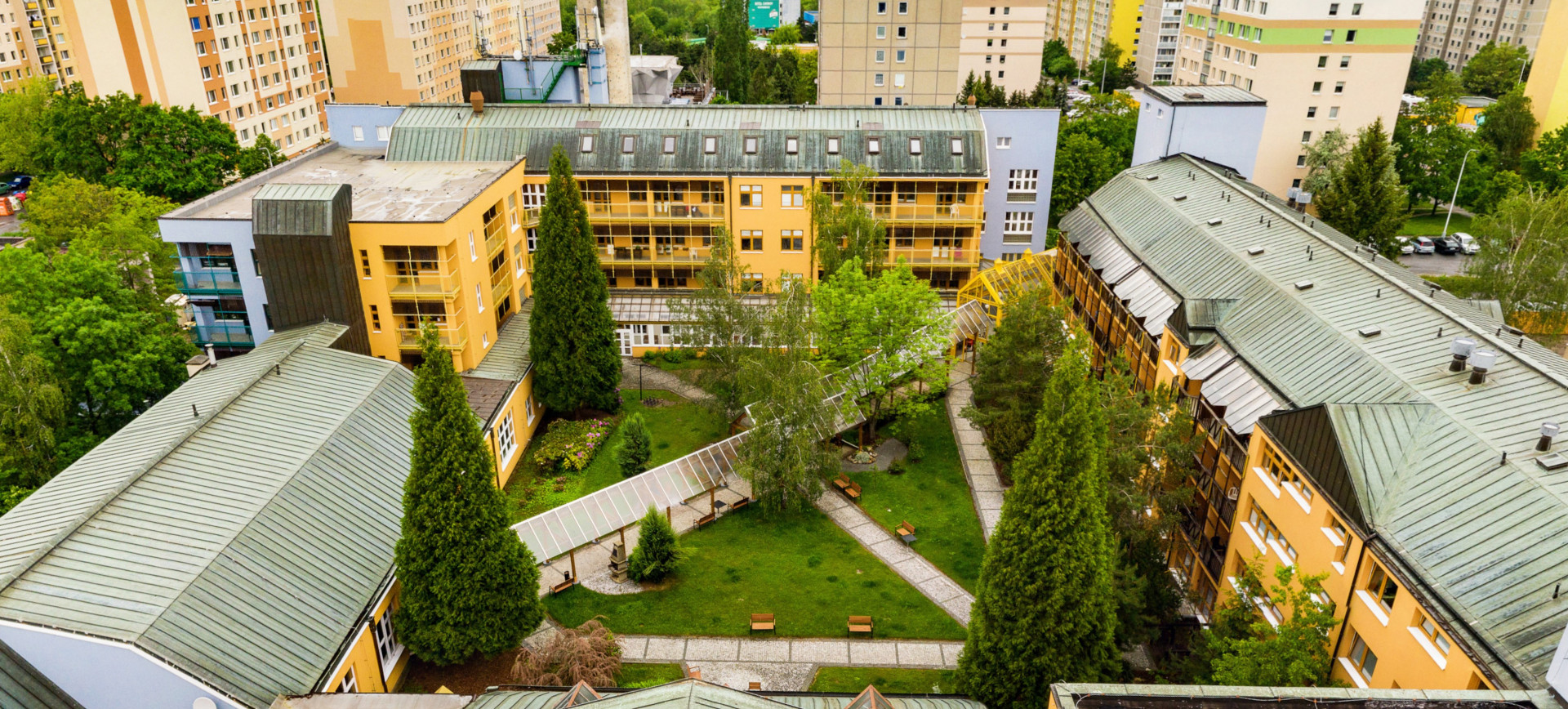 Soubor samostatných domů sestavených ze standardních panelů propojených chodbami z kovu a skla byl koncipován tak, aby v něm našli ideální péči všichni senioři s ohledem na jejich fyzický i psychický stav. V areálu proto vznikly „paneláčky“ pro zdravé a samostatné seniory, domov s pečovatelskou službou, standardní domov důchodců a prostory pro imobilní seniory.