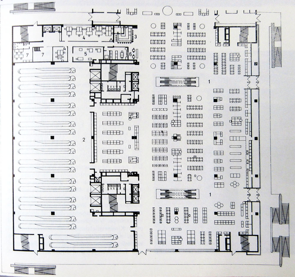 Při návrhu domu autoři kladli důraz především na jeho variabilitu. Do středu čtvercového půdorysu umístili dvě na sobě nezávislá komunikační jádra se schodišti a rychlovýtahy. Před těmito jádry byly umístěny čtyři eskalátory zajišťující hlavní pohyb zákazníků mezi podlažími. Eskalátory byly situovány přímo na osu vstupu z náměstí. Další čtyři schodiště byla rozmístěna vždy do rohu čtvercového půdorysu a sloužila především jako schodiště úniková. Všechny komunikační jádra se v každém podlaží opakují.