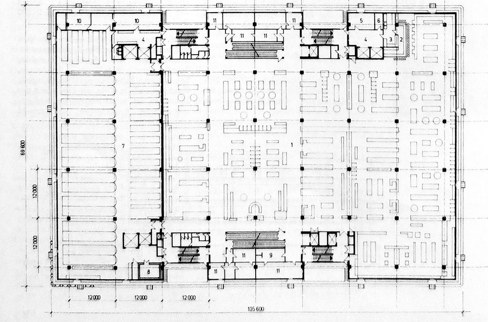 Výstavba domu trvala relativně dlouho. Na přelomu let 1969 a 1970 byly hloubeny výkopy a poté, do roku 1973, byly stavební práce zastaveny. Do otevření domu uběhlo dlouhých 8 let. Konstrukci tvoří monolitický železobetonový skelet o modulu 12 x 12 metrů. Obousměrně pnuté desky byly v místě podpor zesíleny. Proměnná tloušťka desky umožnila i při uvažovaném zatížení 7,5 kN/m2 uprostřed rozponu snížit její tloušťku až na 120 milimetrů.
