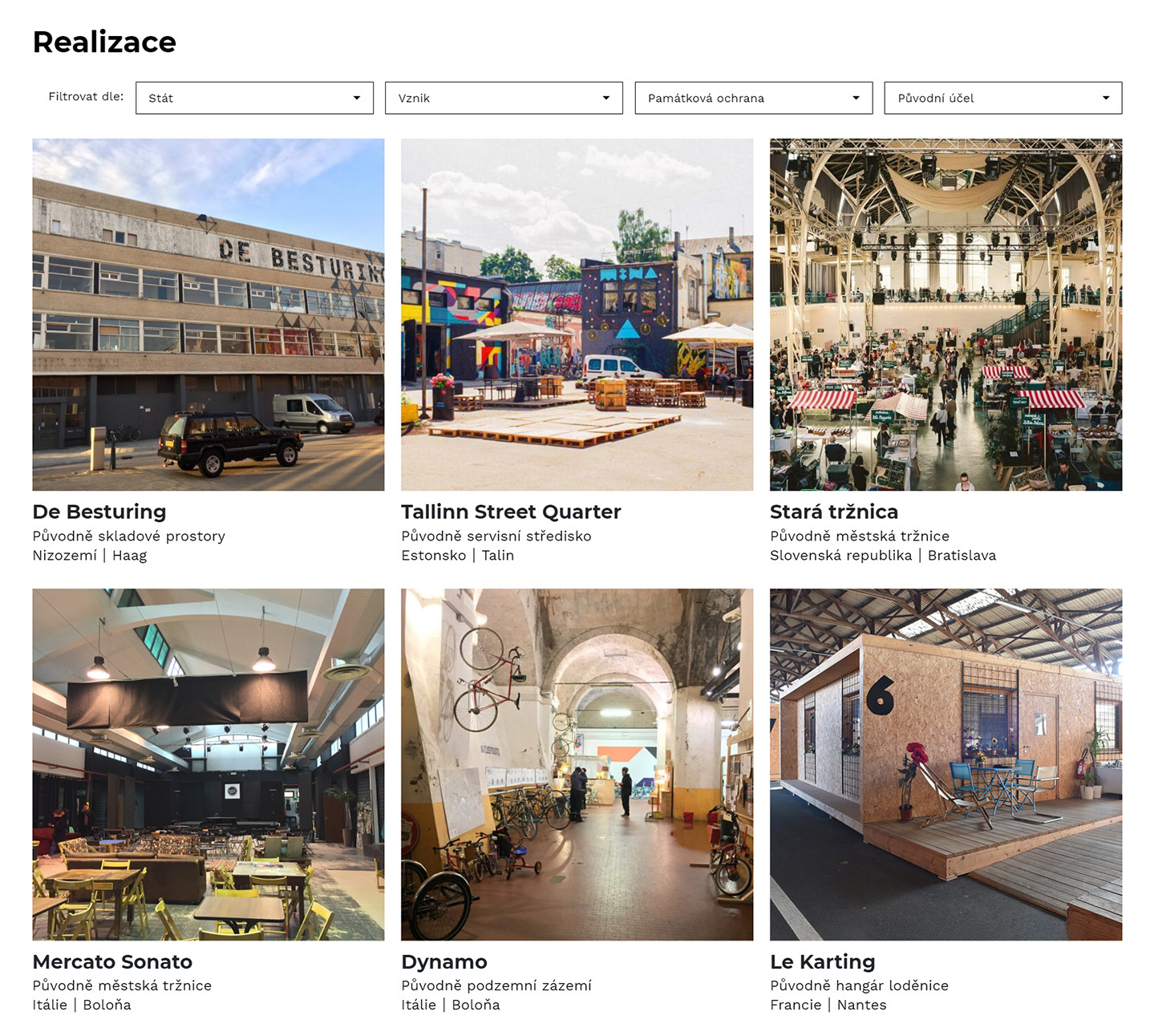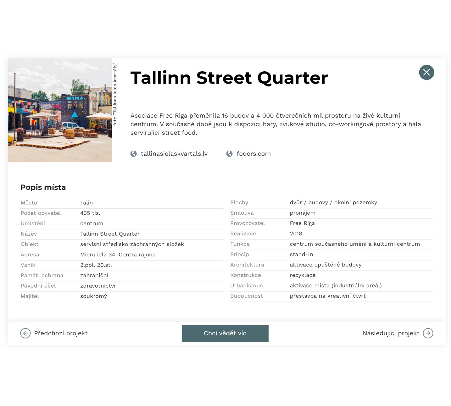 Databáze mapuje úspěšné realizace pop-up v rámci Evropy. Zaměřuje se na dočasné využití opuštěných objektů v rámci jejich opětovné aktivace. Vybrané projekty jsou prezentovány pomocí karet a jejich výběr je možné filtrovat dle daných kritérií.