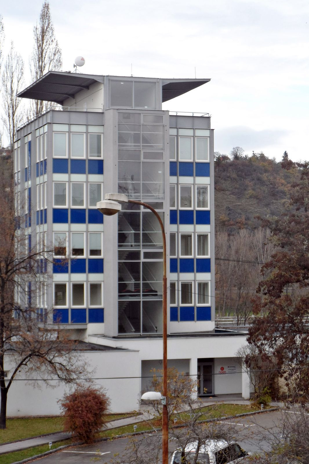 Viditelné ocelové prvky nosné konstrukce byly původně světle modré. V současnosti jsou tmavě šedé a tím se méně uplatňují. Barevnost parapetních panelů se posunula do chladnějšího odstínu modré. Vzhled věže dále definovalo horizontální střídání plných parapetních panelů s prosklenými plochami. Toto střídání je dnes narušeno. Na třech fasádách věže, kromě fasády se schodištěm, je přímo ve středu proveden svislý pás z neprůhledných panelů. Věž tak ztratila svou původní lehkost. V poslední řadě je nutné zmínit rohový styk obvodových panelů. Původní řešení bylo velice subtilní. Dnes je rohový detail o dost robustnější, na to doplácí opět subtilnost věže. Veškeré původní interiérové obklady i mobiliář byly zlikvidovány.