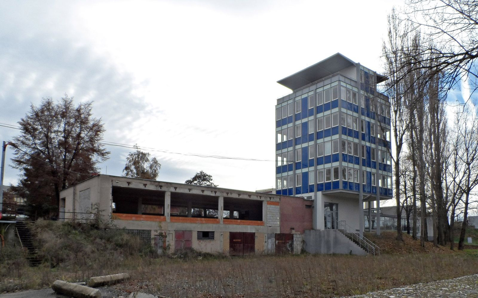 To, čím je objekt výjimečný, je konstrukční řešení administrativní věže. Hlavní nosnou konstrukci tvoří ocelový skelet 3x3 pole o rozměrech 3,6/3,6 metrů. Zavětrování rámů je provedeno pro jeden směr v příčce vedle schodiště, pro zachycení sil ve druhém směru slouží tuhé rámové kouty. Průvlaky tvoří rošt, který je podpírán čtyřmi sloupy. Rohová pole jsou pak zavěšena táhly na nosníky tvořící parapet střešní terasy. Obvodový plášť tvořily modré parapetní panely PT01 Boletice 360/120 v kombinaci s ocelovými okny 360/210.