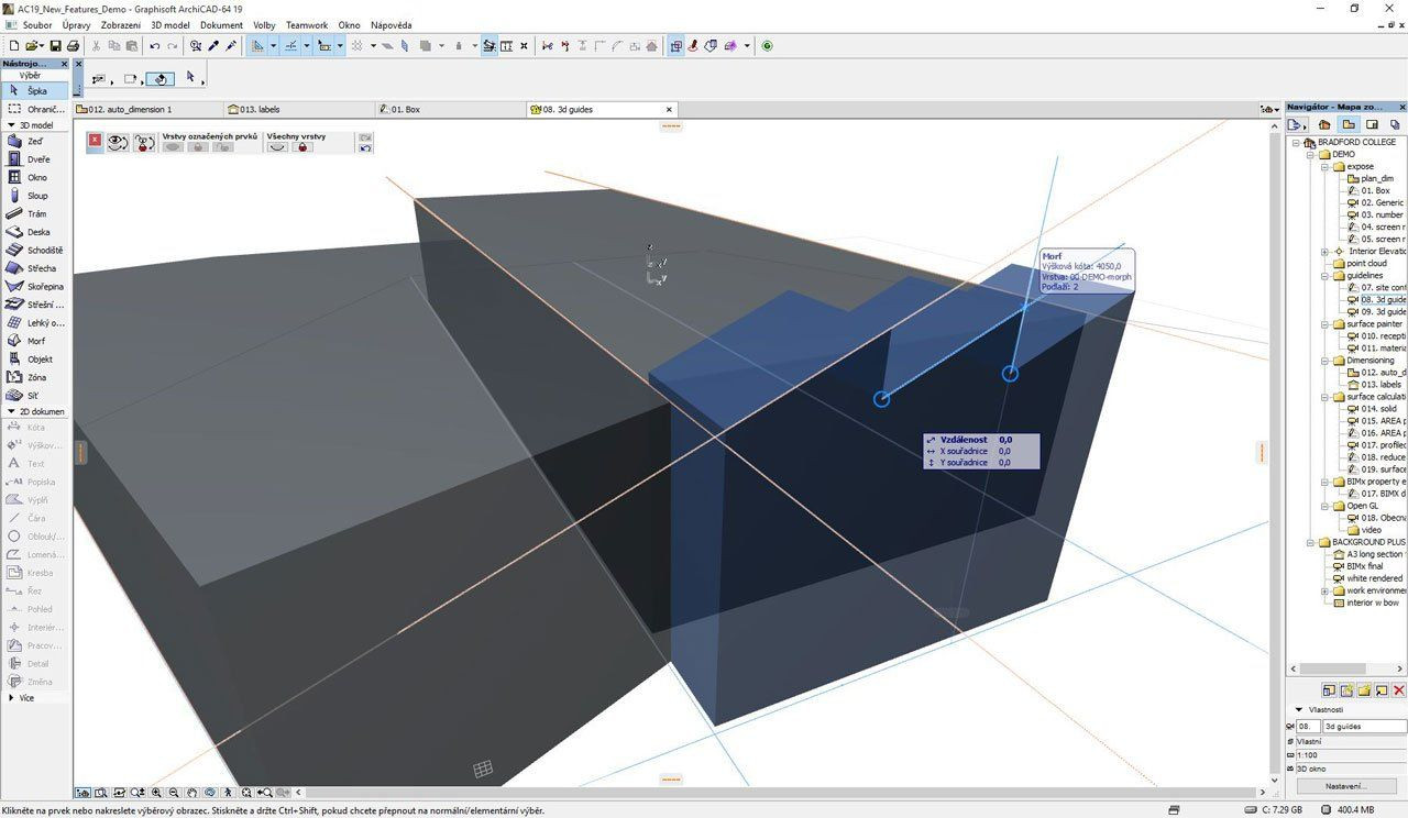 Program se ovšem soustředí i na to, jak nejrychleji přeměnit vize a nápady do BIM modelu. Typické je, že představy architekta vycházejí z mnoha geometrických vazeb (velikost, umístění do okolí, …), které se musejí promítnout do projektu. S pomocí nových vodících čar, pomocných prvků a bodů je tento proces mnohem rychlejší. Navíc tyto pomůcky neslouží jen pro zvýšení efektivity projektování, ale významně zkracují čas potřebný pro zvládnutí ArchiCADu. Nový uživatel, často někdo, kdo ovládá 2D CAD, díky srozumitelnému interaktivnímu prostředí snadno pronikne do 3D. (Obr. 4) 3D skener a BIM projektování