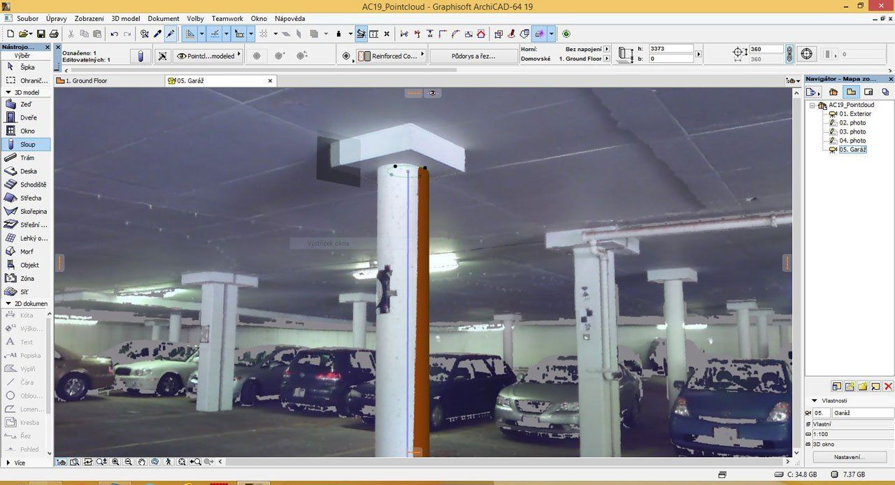 ArchiCAD 19 dokáže načíst nejběžnější formáty mračen bodů (E57, XYZ - Point Cloud) a z těchto dat pořízených 3D skenerem obratem vytvořit odpovídající 3D model. Díky tomu lze porovnat navrhované řešení se 100% přesným 3D zaměřením stávajícího stavu (Obr. 5). Takový pracovní postup významně redukuje čas potřebný pro zpracování zaměření a eliminuje chyby způsobené manuálním zadáváním rozměrů.