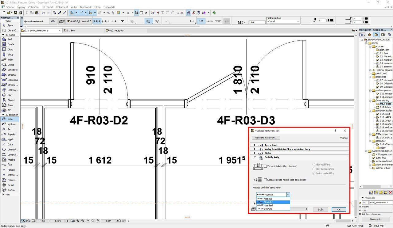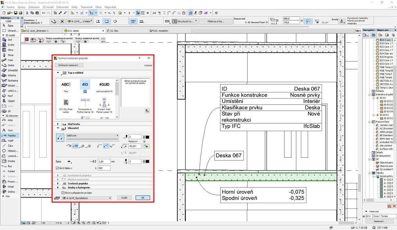 Kromě výpočetní síly jádra programu, ovlivňuje efektivitu projektování jednoduchost a přímočarost ovládání. Méně nutných kliknutí zvyšuje rychlost práce i dobrou náladu uživatele. „Devatenáctka„ prohlubuje automatizaci zpracování dokumentace i modelování. Kóty malých rozměrů či husté řetězce kót dělají výkresy nepřehledné, což bylo nutné řešit manuálním přemístěním textu kóty. Nová funkce Šipka pro texty kót zjednodušuje nutné úpravy výkresů. Automaticky se zapne, jakmile projektant pohne textem kóty mimo vymezenou oblast. ArchiCAD 19 rovněž automaticky řeší problém s příliš „zahuštěnými“ řetězci kót. Program rozmístí texty směrem od kótovací čáry tak, aby byly čitelné. (Obr. 2) Stále častějším požadavkem je možnost přiřadit k jednomu objektu více popisek, např. vypsat skladbu konstrukce, protipožární vlastnosti, ID a „devatenáctka“ toto umí. (Obr. 3)