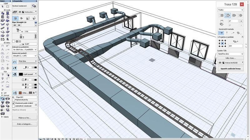 Vkládání jednotlivých prvků systému ručně – přímé díly, odbočky, zahnuté díly, redukce atd. - na přesné místo v projektu. Uživatel tak sám nastavuje parametry a nastavení všech částí systému má pod kontrolou. Výhodou je automatické přizpůsobení vkládaného prvku předchozímu dílu. Je-li například aktivní nástroj odbočka vzduchotechniky a uživatel klikne na koncový bod příslušného VZT systému, ArchiCAD automaticky nastaví dimenze odbočky tak, aby „pasovala“ na cílový systém a dá uživateli na výběr, kterým směrem má být odbočka orientována. Druhou možností je využití paletky TZB, která kromě nastavení hlavních vlastností systému (systém, materiál, izolace, typ spoje atd.), umožňuje zapnout i funkci trasování TZB. Tato funkce umožňuje uživateli nakreslit trasu – referenční čáru, na kterou pak ArchiCAD automaticky „osadí“ příslušné prvky systému. Samozřejmostí je možnost nastavení změny výšky – je možné ji zadat ve stupních, v procentech nebo například v milimetrech na metr. A také v tomto případě dokáže ArchiCAD přizpůsobit nové prvky těm stávajícím. Uživatel zapne zadávání trasy a klikne na část z již existujícího systému. Jedná-li se o koncový bod, může pokračovat v zadávání trasy. Pokud klikne na referenční čáru potrubí, musí nejprve určit, jak má být nové potrubí napojeno – T-spoj, odbočka. Pak pokračuje v zadávání trasy. Při kreslení trasy je možné upravovat i rozměry. Pokud uživatel v půlce trasy změní dimenzi potrubí, program na místo, kde ke změně došlo, automaticky vloží redukci.
