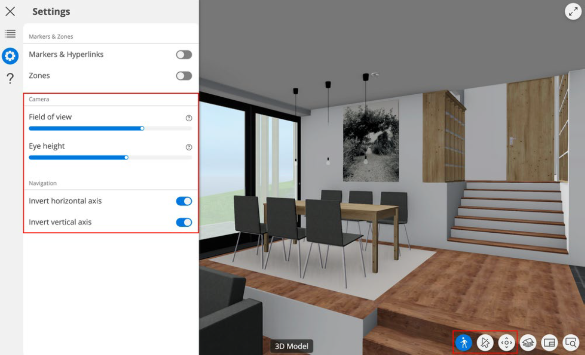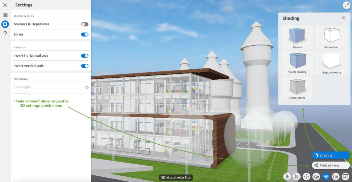Desktopová a webová verze BIMx obsahují možnosti změny jednotek pro účely měření, výběr stylu zobrazení stínování ve 3D, ale také plynulé nastavení zorného úhlu posuvníkem.
