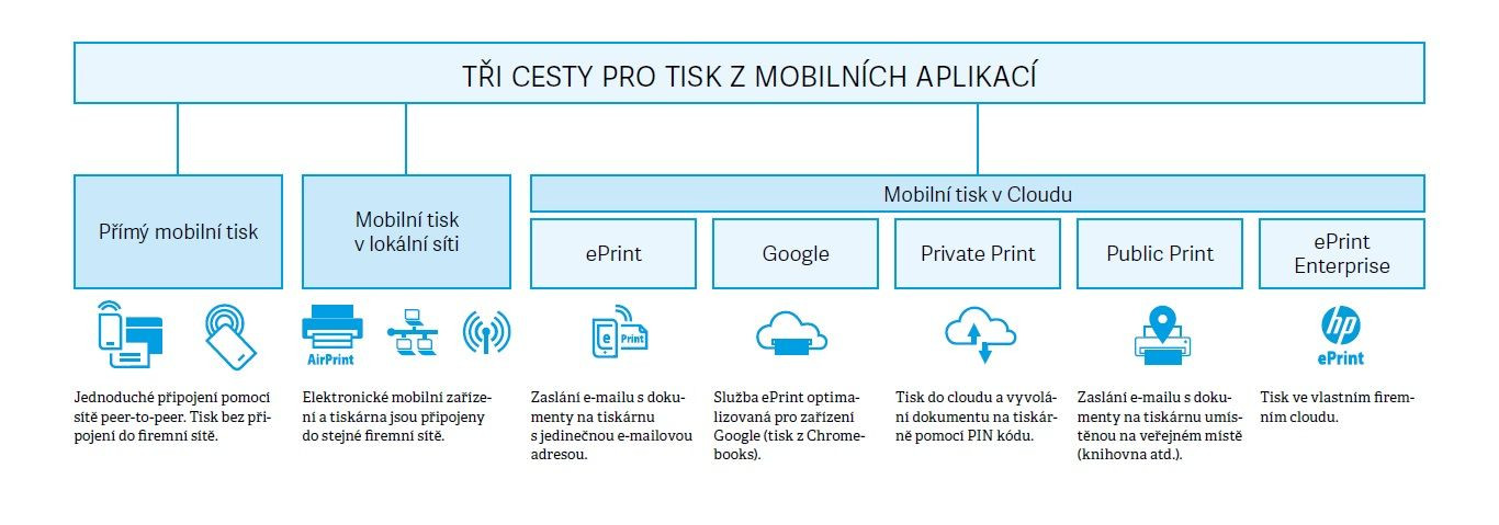 Pokud vynecháme klasické (a nutno dodat zastaralé) kabelové připojení v ethernetové síti, nabízejí se nám přesně tři cesty pro pohodlný tisk z mobilních aplikací. V první řadě jde o přímý mobilní tisk bez nutnosti připojení do firemní sítě. Druhou možností je mobilní tisk v lokální síti, při kterém jsou elektronická mobilní zařízení a tiskárna propojeny ve stejné firemní síti. Třetí možnost pak představuje mobilní tisk v Cloudu, jenž lze realizovat prakticky odkudkoli.