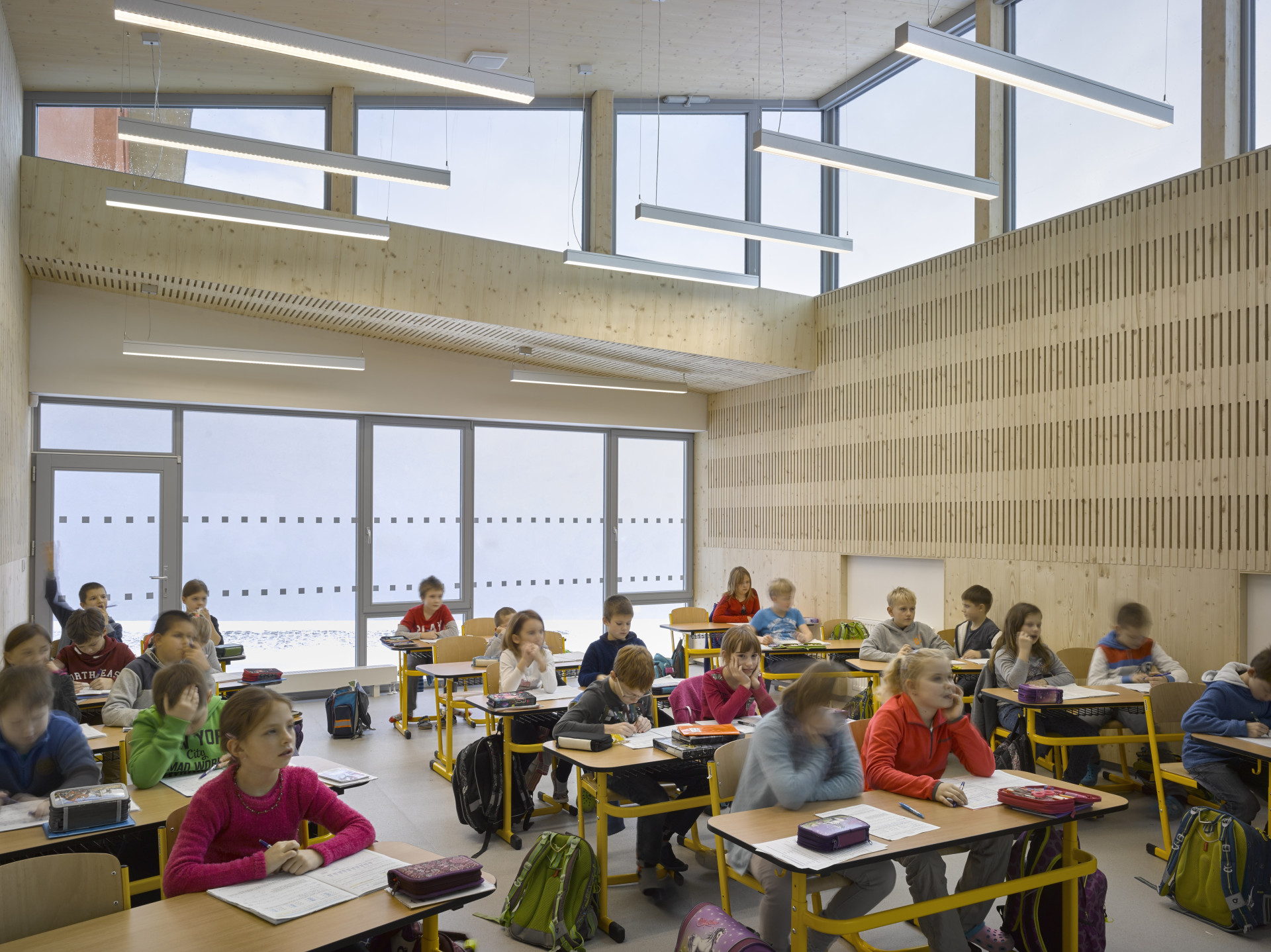 Díky rekonstrukci budov z roku 1904 se Základní škola v Nučicích rozrostla o půdní vestavbu a dvě přístavby pro kmenové třídy a školku. Konstrukce přístavby je kombinací zděného systému a CLT. V interiéru zůstala část dřevěné konstrukce přiznaná a dominantní roli mají dřevěné akustické panely NOVATOP, které příjemně eliminují hluk ve třídách.