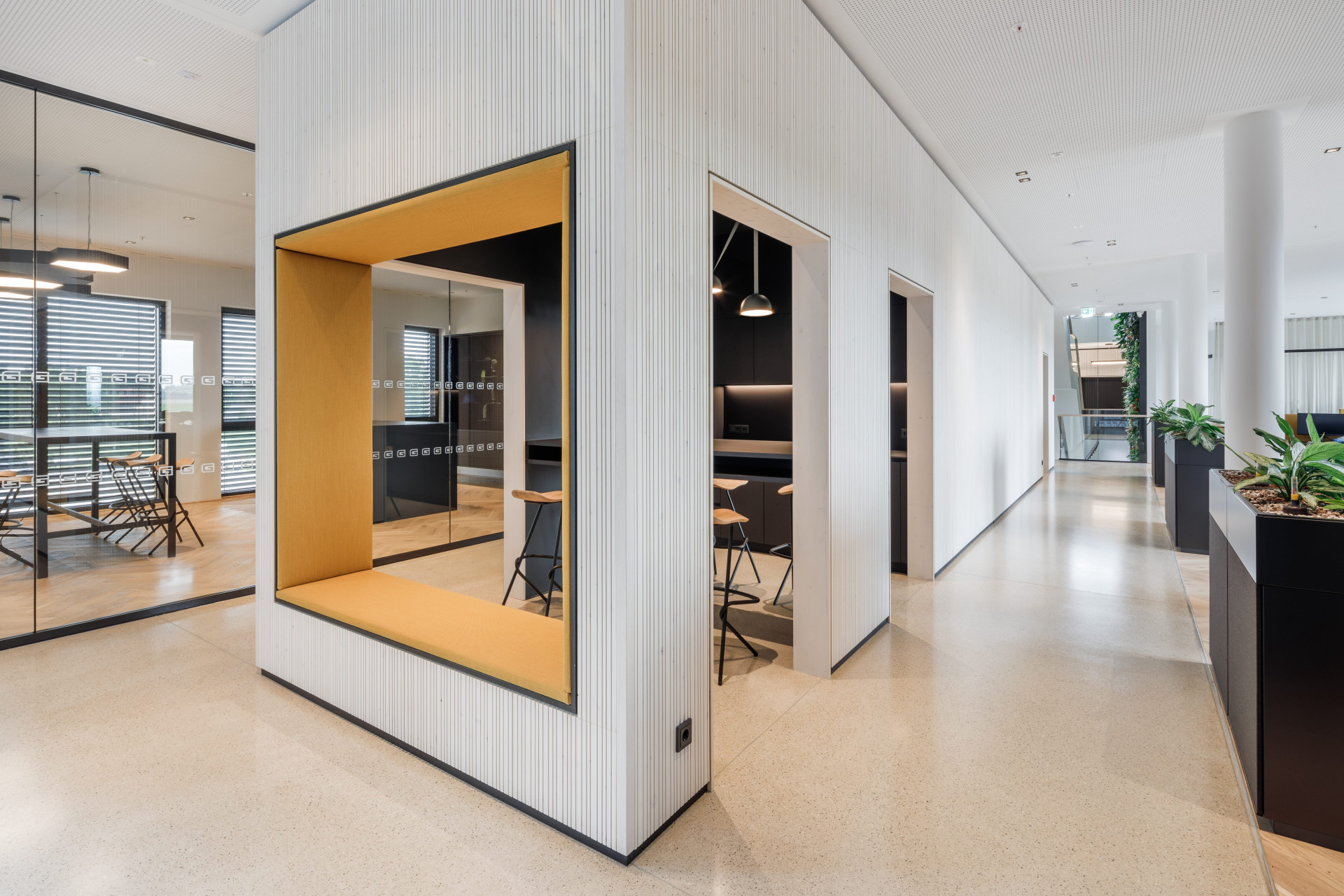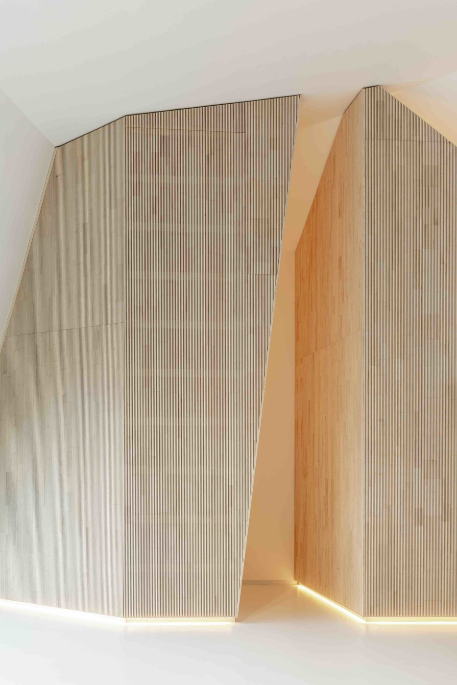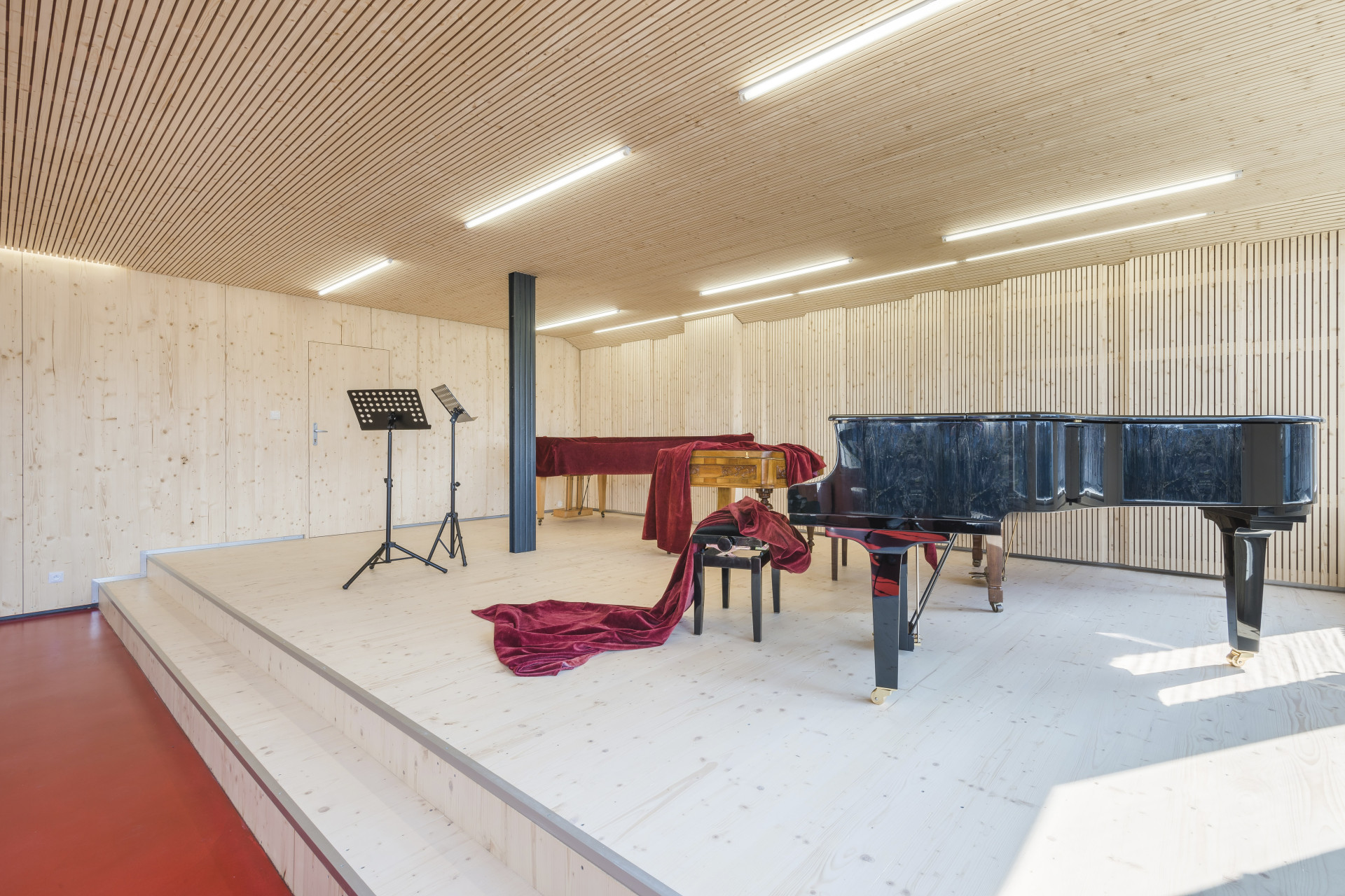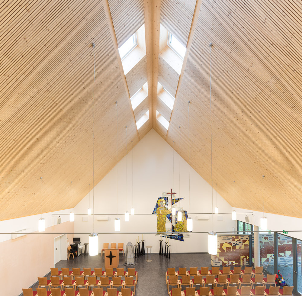 Správná akustika umožňuje vytvořit prostor, kde hudba a hlasový projev zní autenticky. To se povedlo v obřadní síni v Německu, kde dominantu interiéru tvoří velkoryse dimenzovaná výška střechy obložená dřevěnými akustickými panely.