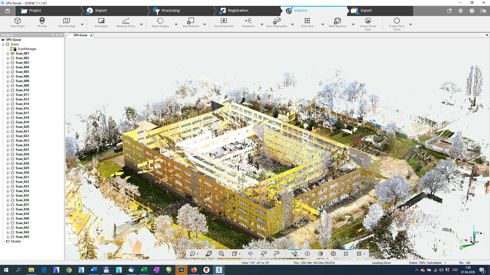 Náhled na barevné mračno bodů, exteriéru budovy