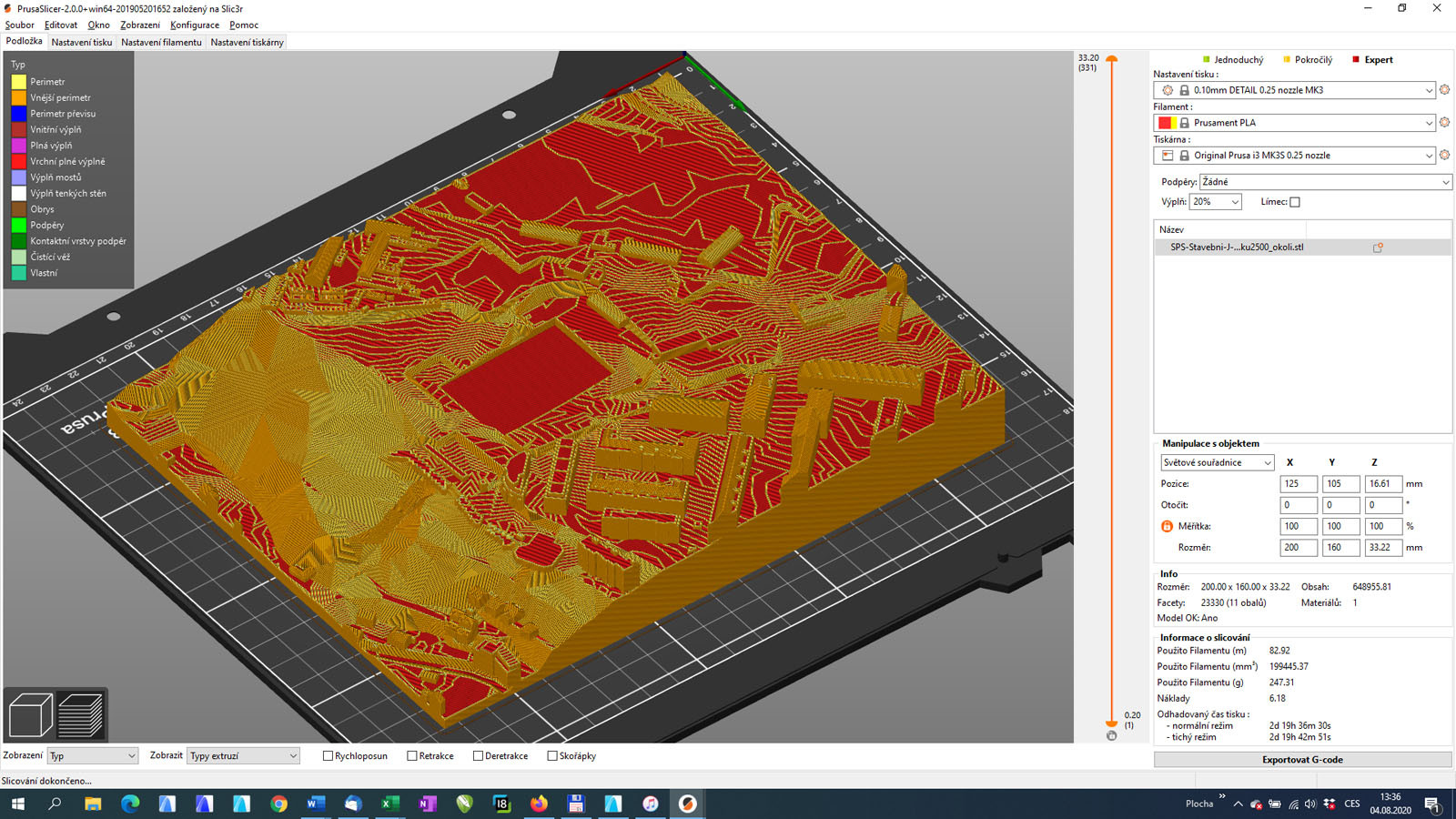3D model budovy a jejího okolí jsme v Archicadu upravili pro potřeby 3D tisku a uložili jej ve formátu STL. Tento 3D souborový formát sám o sobě není ještě tiskovým souborem pro 3D tiskárnu. Ten musíme vytvořit pomocí software dodávaného spolu s 3D tiskárnou. Protože pro tisk využijeme 3D tiskárnu Original Prusa i3 MK3S budeme potřebovat náš STL soubor zpracovat pomocí software Prusa Slicer, ten připraví kód (G-code), v závislosti na použitém materiálu pro tisk, kvalitě tisku, kterému tiskárna porozumí. Z tohoto souboru bude 3D tiskárna dostávat pokyny pro tisk 3D modelu. Software Prusa Slicer nám nejen zpracuje kód pro tiskárnu, ale také nám ukáže vizuálně 3D model po konverzi ze souboru STL. V náhledu na tiskové ploše lze ještě 3D model upravovat, změnit jeho měřítko, umístit více 3D modelů na tiskovou podložku a další. Užitečná je také funkcionalita opravy 3D modelu (v tomto případě online služba Netfabb), kdy se někdy může objevit chyba v modelu (neuzavřené hmoty) a která většinou chybu v modelu dokáže opravit.