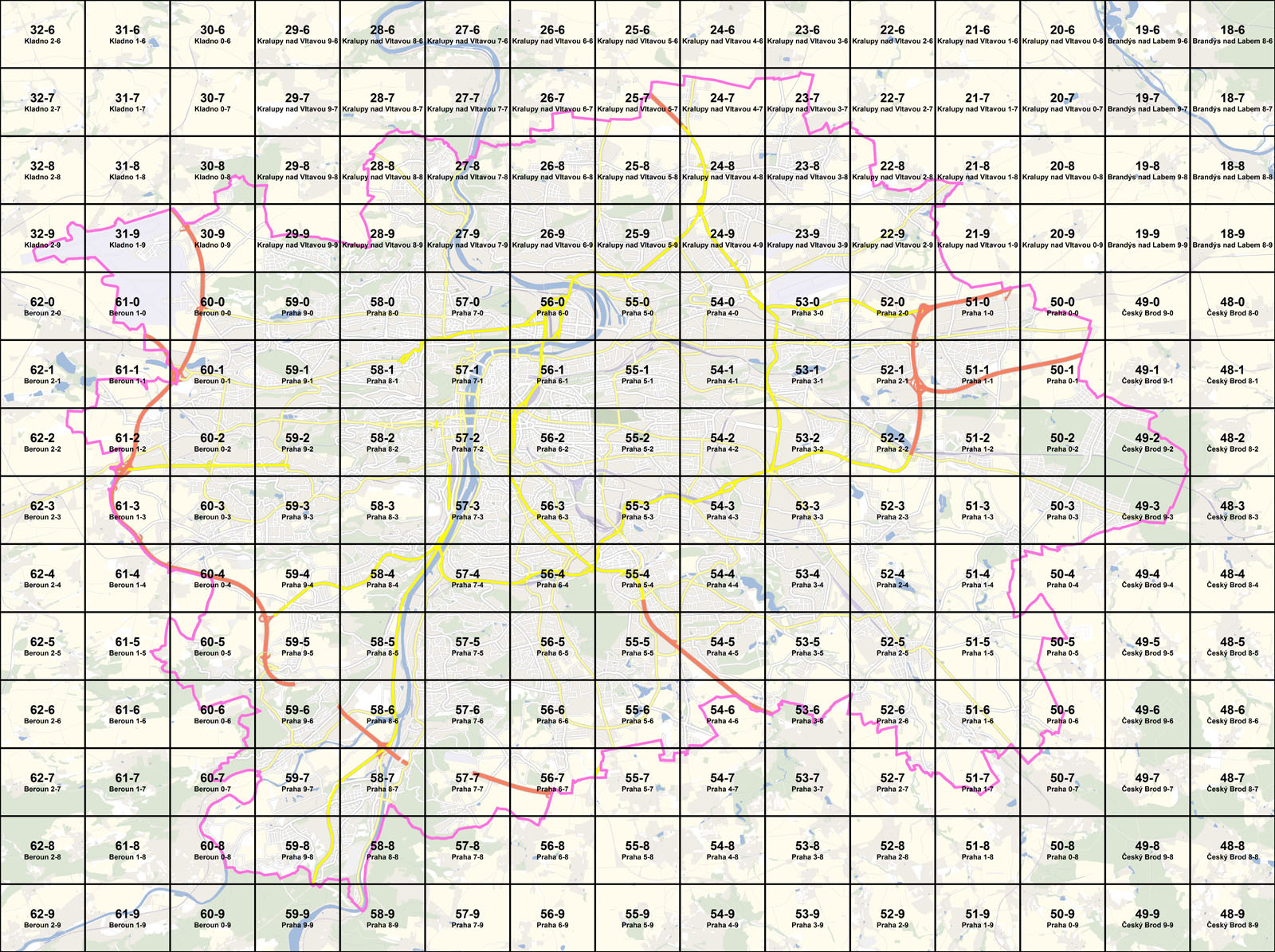 Mapa Prahy na tzv. kladu mapových listů, kde je každý mapový list pojmenován a očíslován.