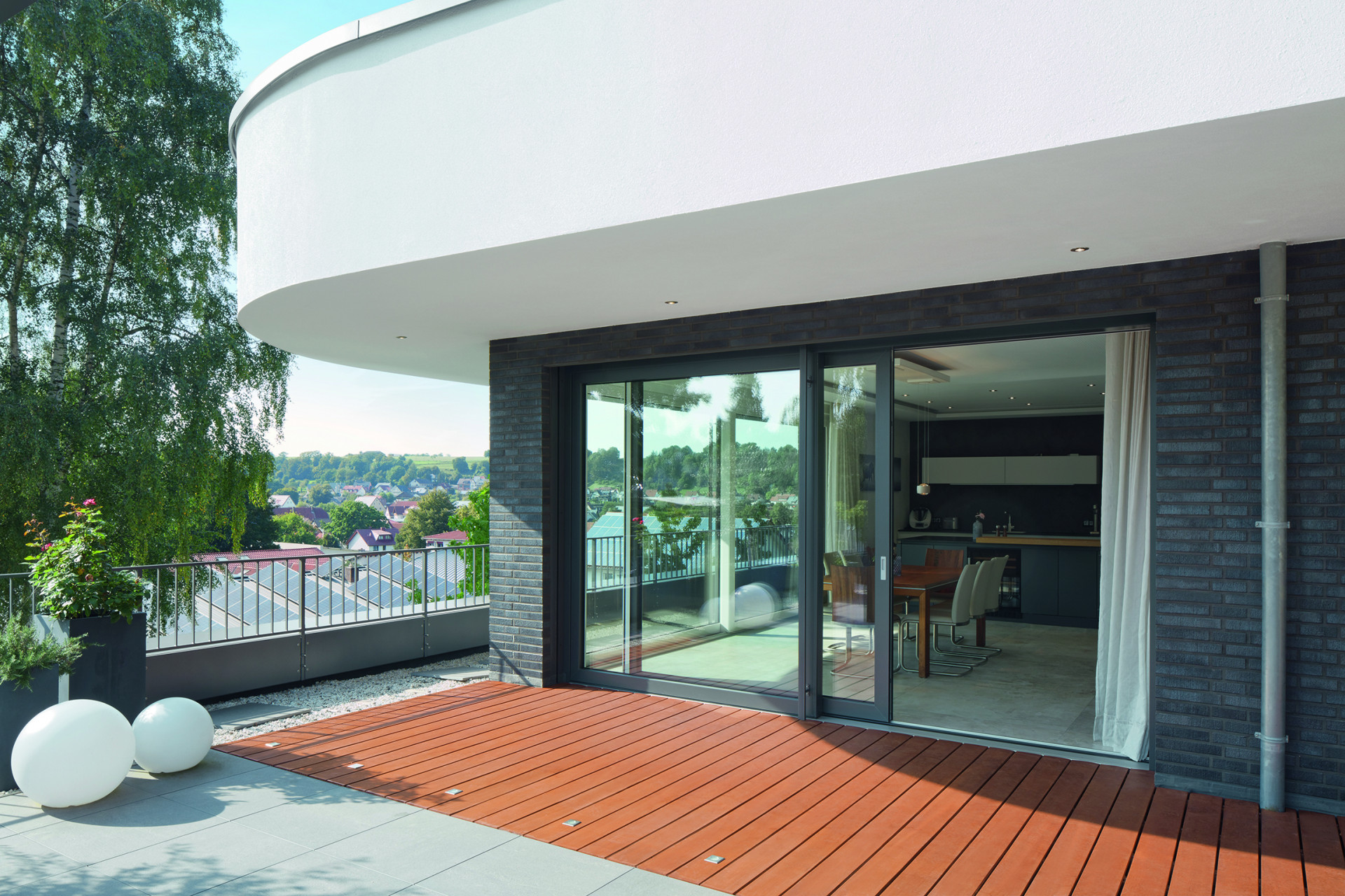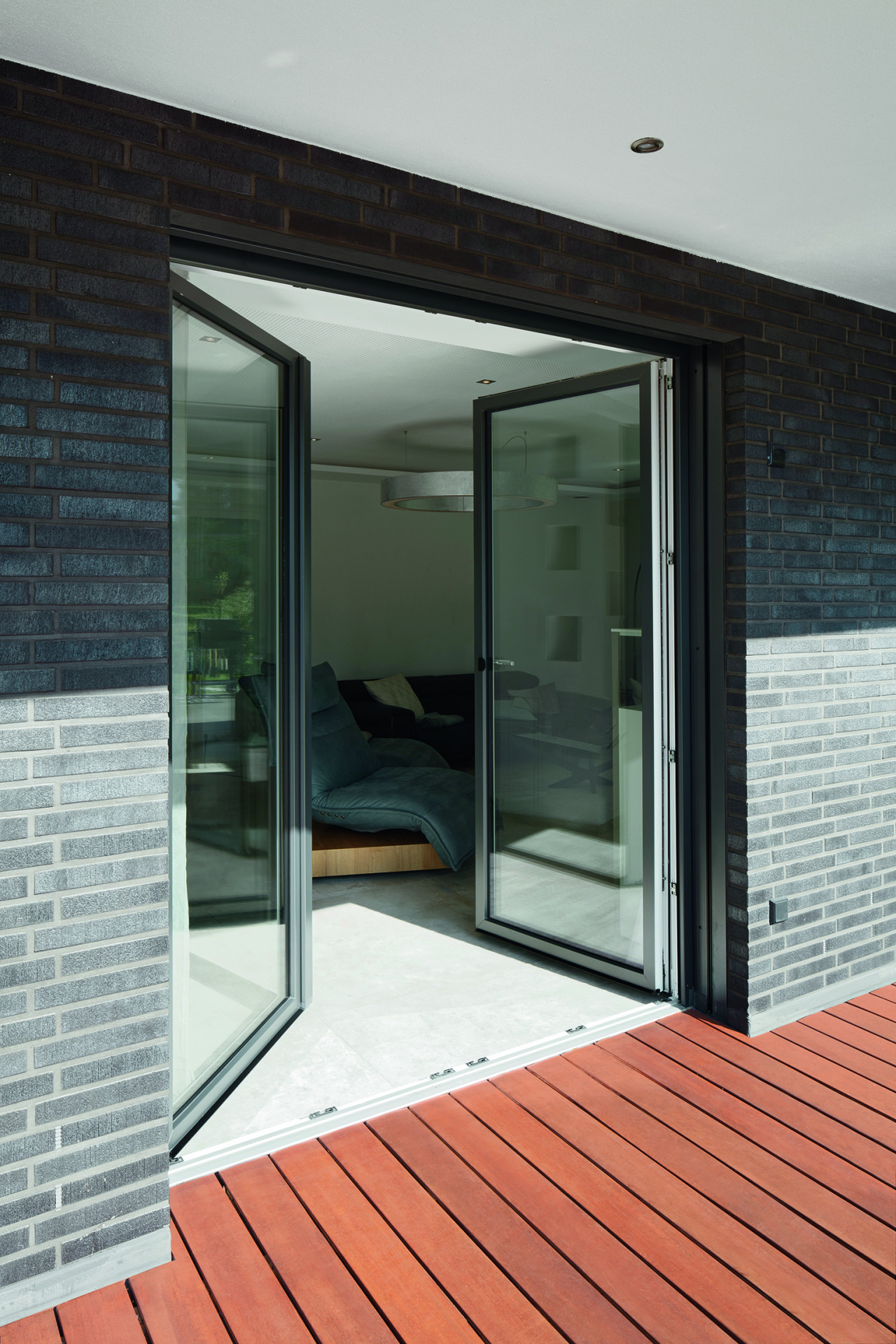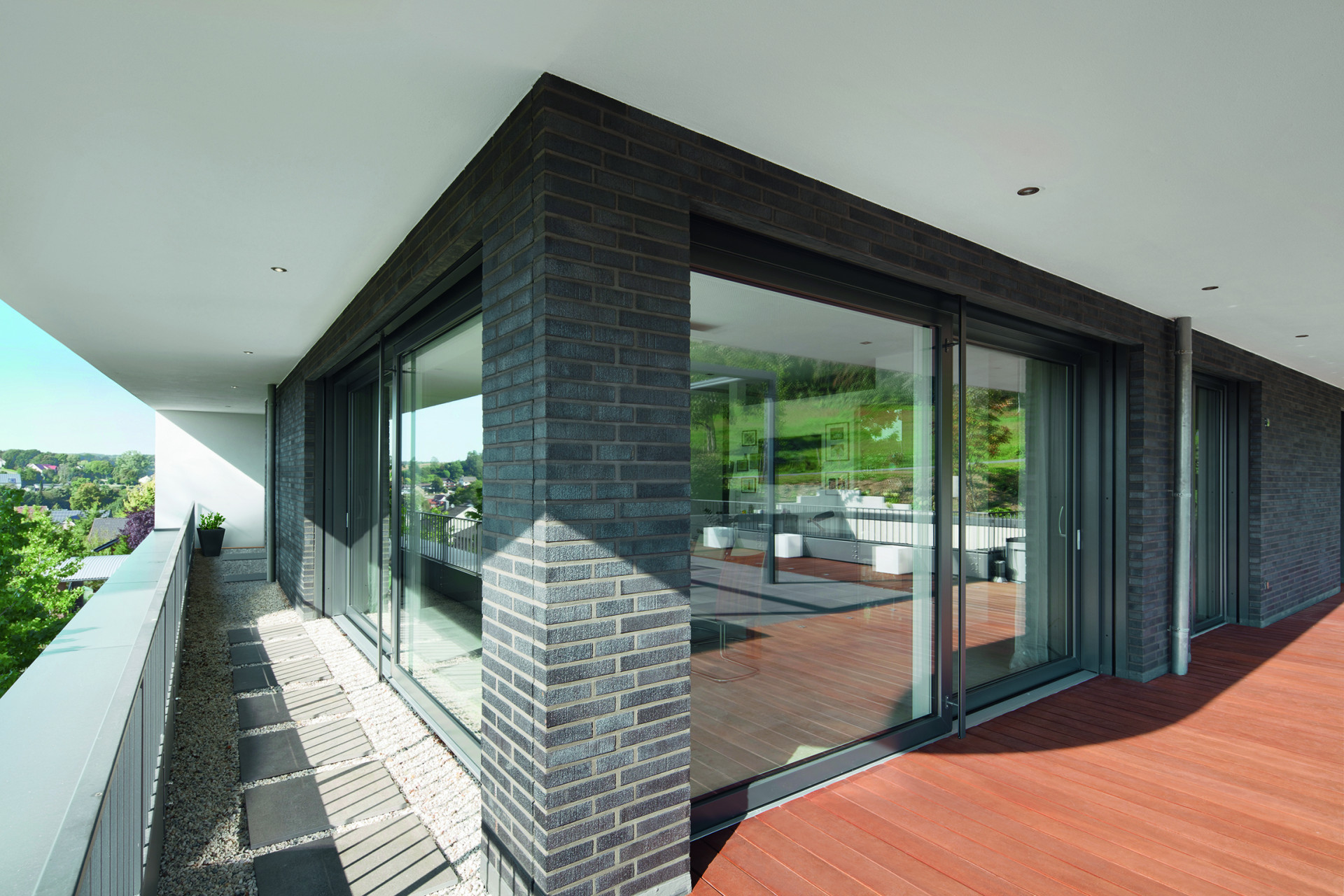 Vzdušné prosvětlené prostory s krásnými výhledy vytvořily systémy pevných oken i posuvných prvků Schüco, z nichž si architekti mohli dovolit navrhnout i řešení na výšku celého podlaží a v šířce až 5,2 m, samozřejmě vždy s trojsklem pro maximální tepelněizolační ochranu. Plastové povrchy úzkých profilů byly sladěny s tmavými lícovými cihlami fasády díky exkluzivní technologii metalických barev Schüco AutomotiveFinish.