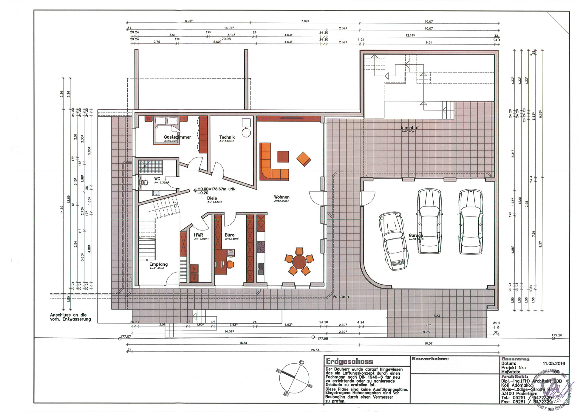 „Přirozené denní světlo by mělo osvětlovat cestu domem a stát se průvodcem jeho obyvatel i hostů,“ věří architekt Joseph Cornelius Adomako. V duchu této koncepce byla navržena vzdušná vstupní hala na výšku dvou podlaží, která je prosvětlena rozměrnými okny. Hosté se odtud po schodišti dostanou do částečně tmavší chodby se zkosenými stěnami, odkud je cesta a pohledy vedou dále do opět mimořádně prosvětlené obytné zóny. Soukromé prostory domu (tedy ložnice a koupelny) jsou úmyslně situovány do zadní části a ustupují do pozadí. Velkorysá přízemní garáž je ohraničena, ale zároveň otevřena velkými prosklenými plochami do zahrady a nádvoří, díky čemuž mají klienti neustále na očích svou sbírku veteránů.