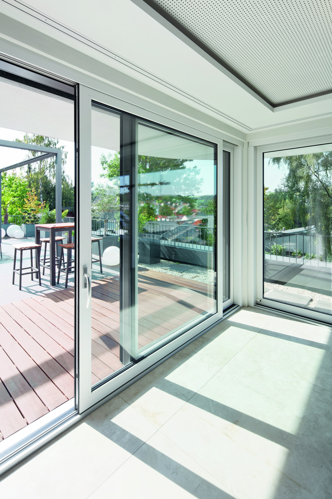 Foto: Obytná a jídelní zóna v prvním patře: Z posuvných systémů Schüco PVC-U bylo možné vytvořeny prvky s rozměry až 5,2 x 2,5 m (š x v).
