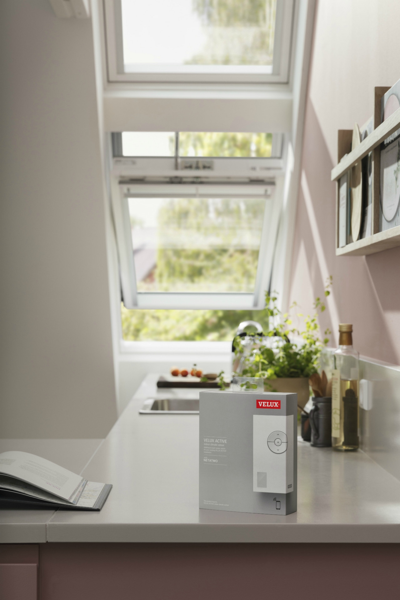 VELUX ACTIVE with NETATMO se skládá ze tří součástí – senzoru, brány a centrálního vypínače – a je kompatibilní se všemi elektrickými produkty VELUX INTEGRA® a s manuálními střešními okny s doplněným elektrickým nebo solárním pohonem . Senzor umístěný v místnosti, v níž je instalováno střešní okno, měří CO2, vlhkost a teplotu a současně monitoruje data o počasí z on-line služeb. Do senzorů jsou zabudovány pokročilé algoritmy, které aktivují větrání a stínění.