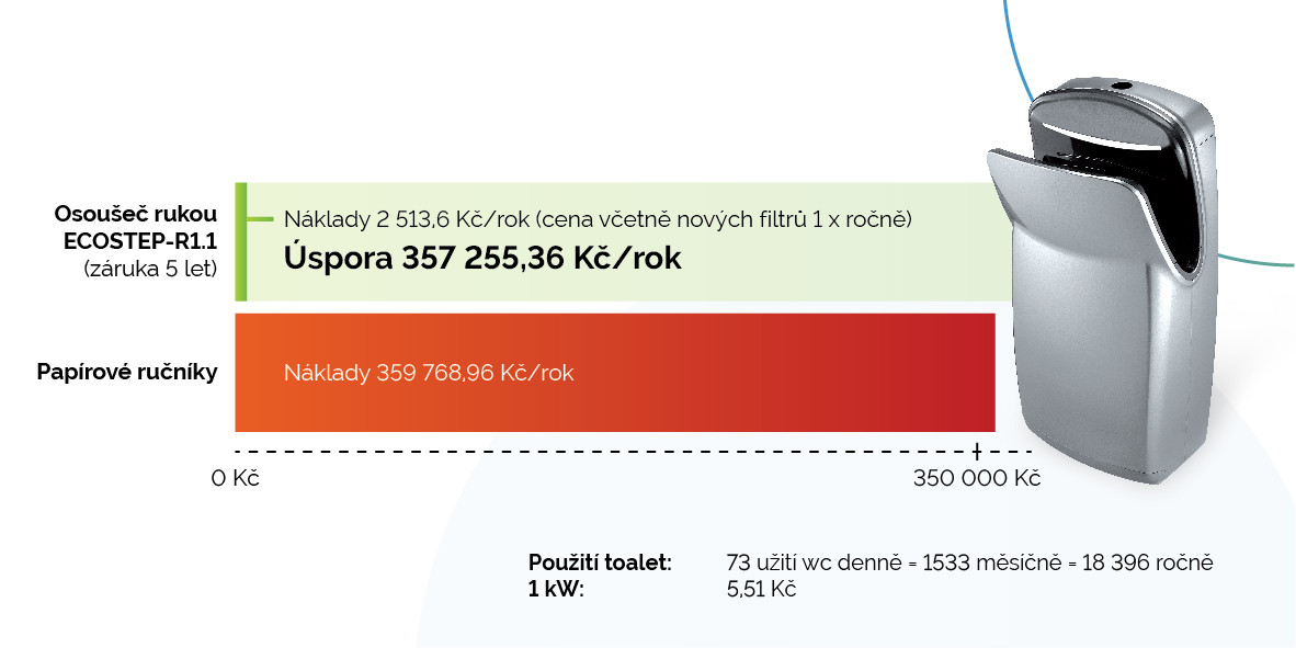 Také návratnost investice do osoušečů rukou byla extrémně rychlá. Celkové roční provozní náklady dvou instalovaných osoušečů R1.1 a čtyř osoušečů R4.1 vycházejí jen na 2 513 Kč bez DPH. V porovnání s náklady na papírové ručníky a související servis se jedná o úsporu více než 357 000 Kč bez DPH za rok.