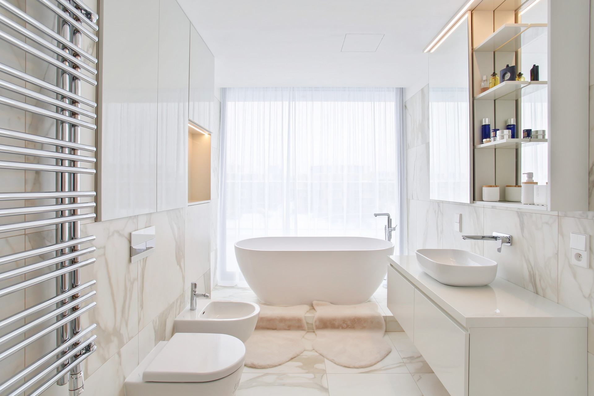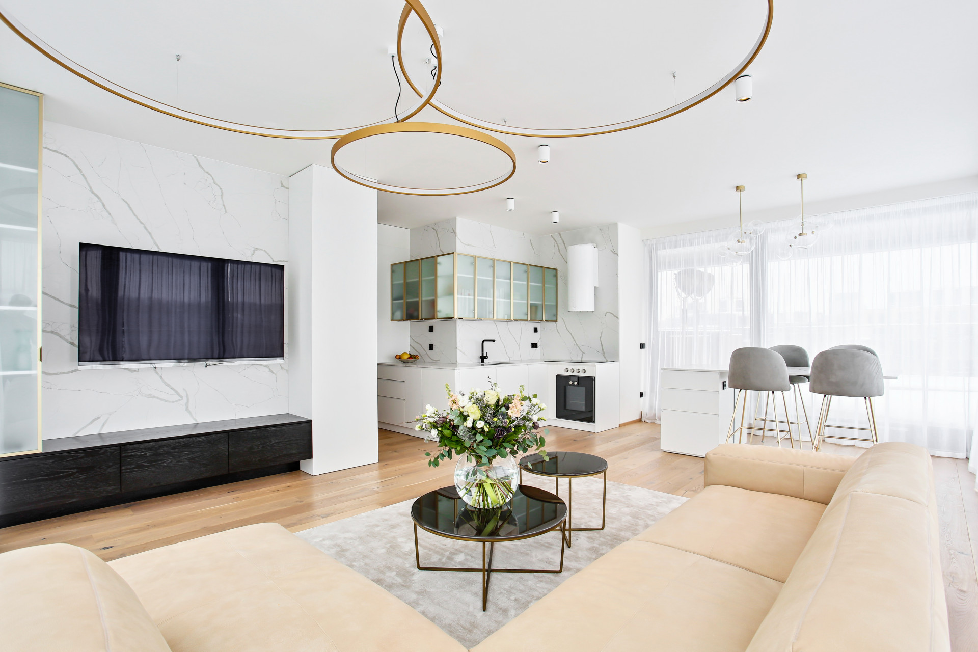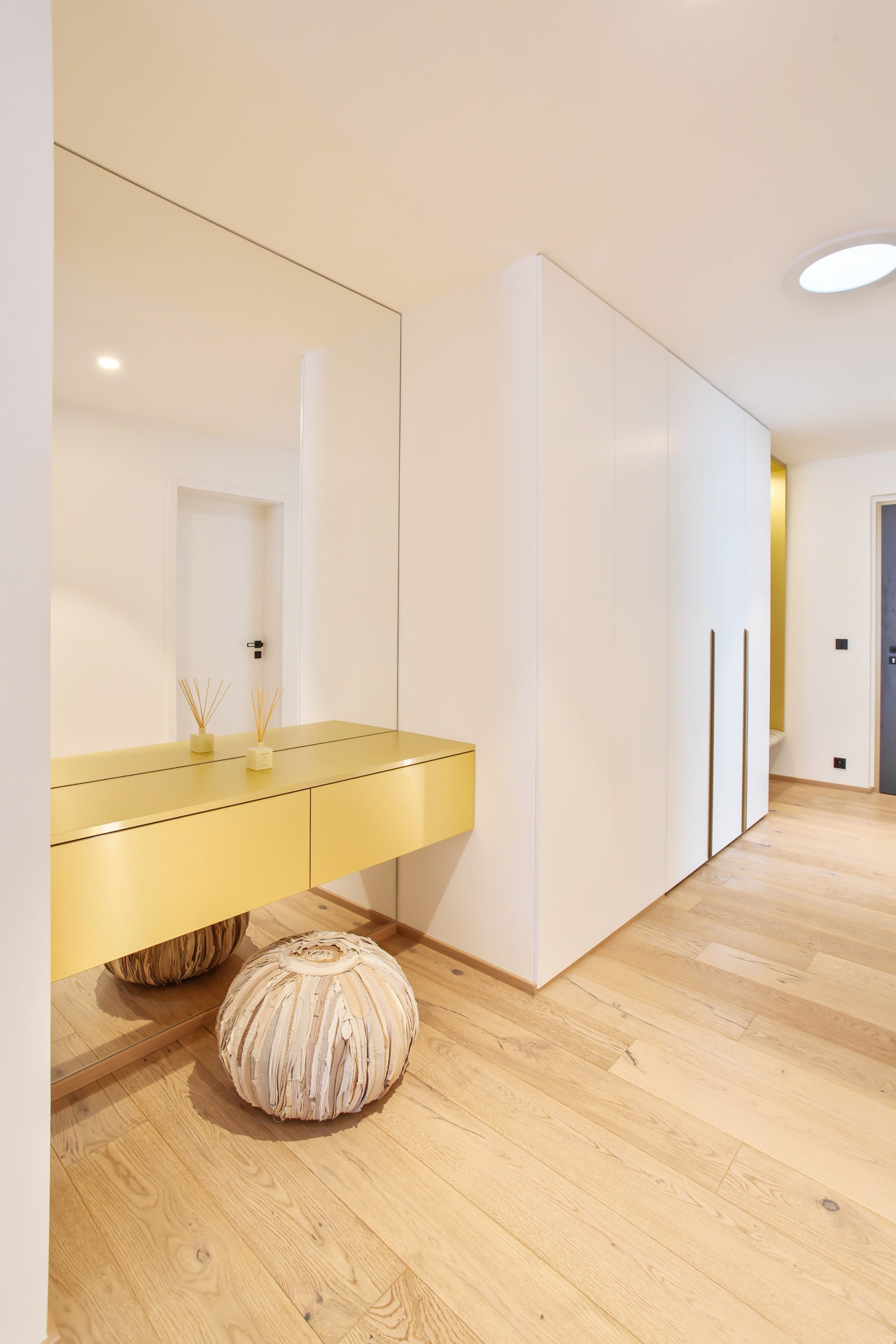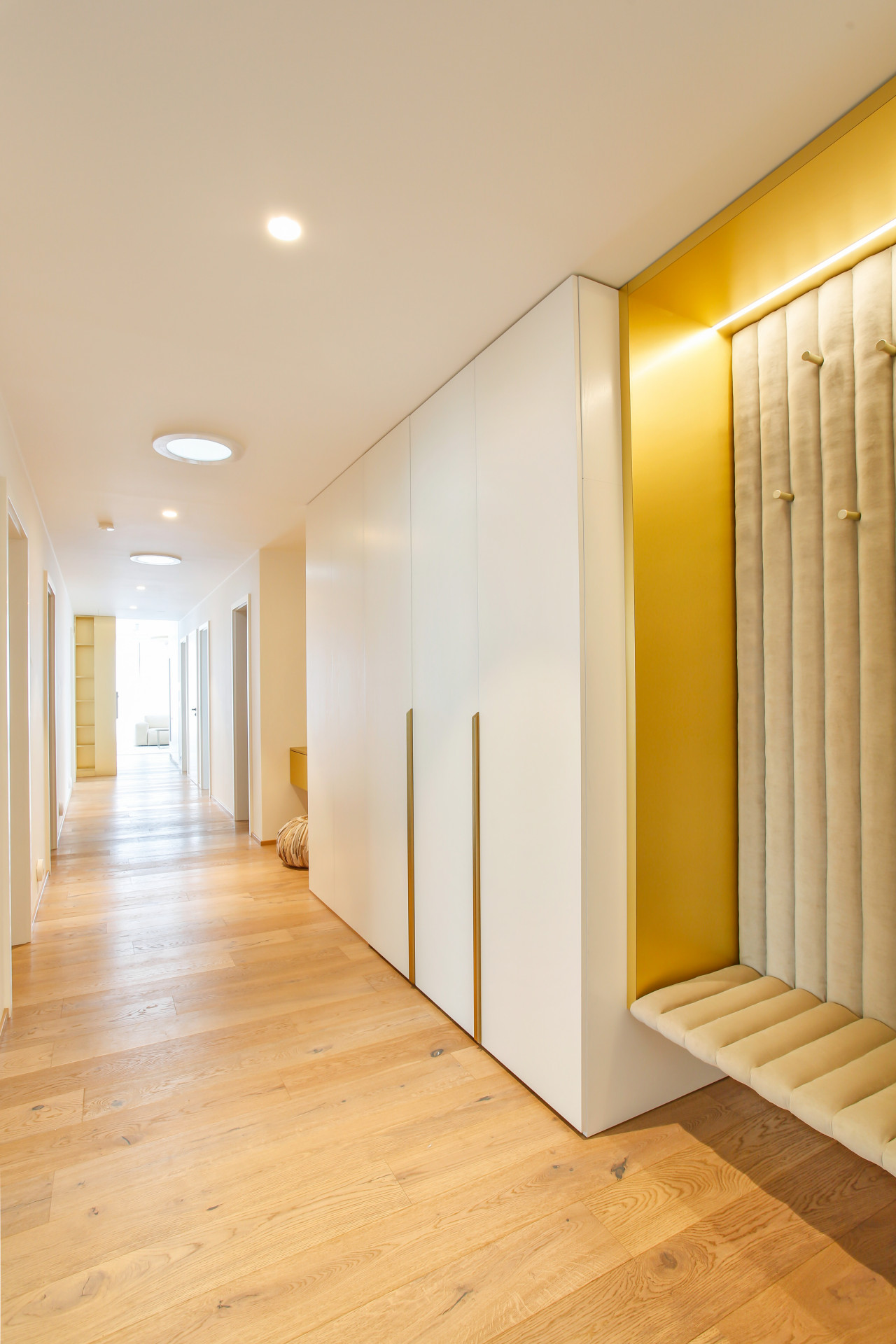 Stůl se skleněnou podnoží, oválná světla v obývacím pokoji a niky v chodbě tvoří výrazné prvky interiéru. Všechny spojuje všudypřítomná zlatá barva – oživující detail bílého obkladu. Konferenční kulaté stolky v obývacím pokoji kopírují tvar světel nad nimi. Podsvětlení jednotlivého nábytku pak dotváří celkovou klidnou atmosféru bytu.