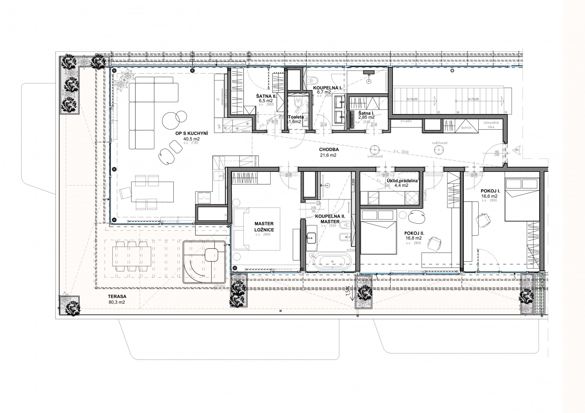 Vzhledem k tomu, že interiér bytu vznikal v novostavbě, jeho autoři mohli zasáhnout také do dispozičního řešení exteriéru, kde se měnila například výška rozměrově prostorné terasy o ploše necelých 80 m². Majitelé na ni mohou vstoupit jak z velkého obývacího prostoru, tak i z dalších místností. V bytě najdeme hned dvě koupelny, dětské pokoje a samostatnou prádelnu. Díky světlým barvám působí celý byt vzdušeným dojmem.